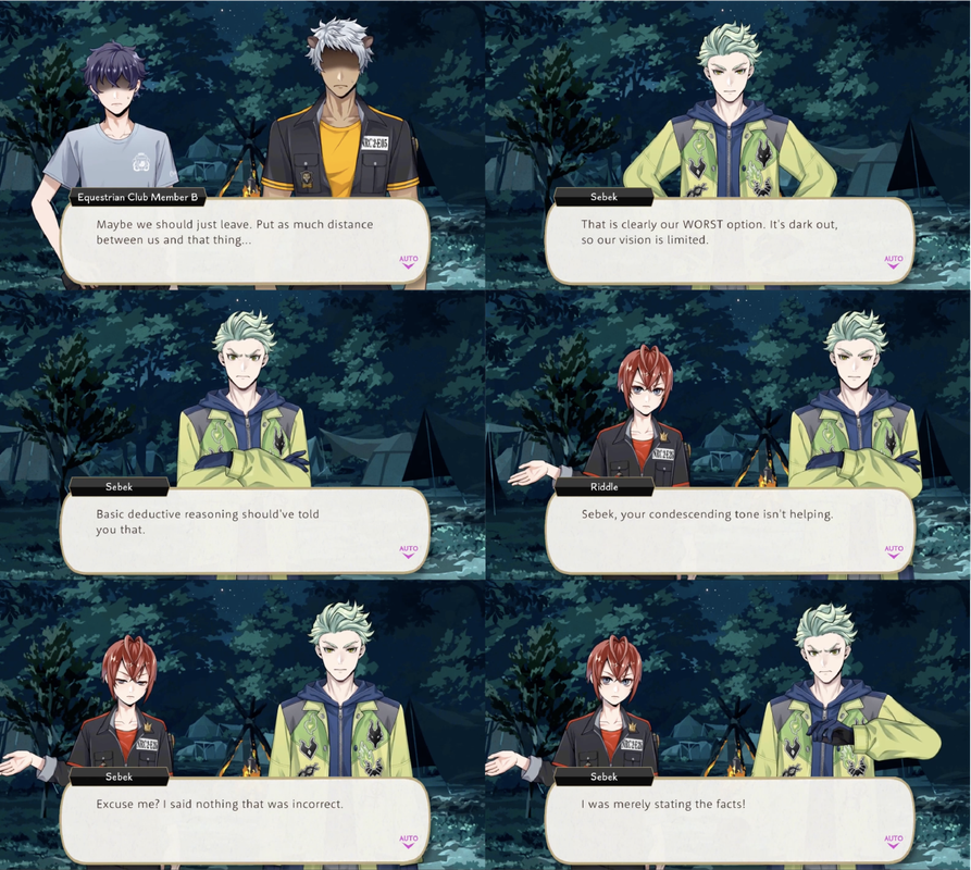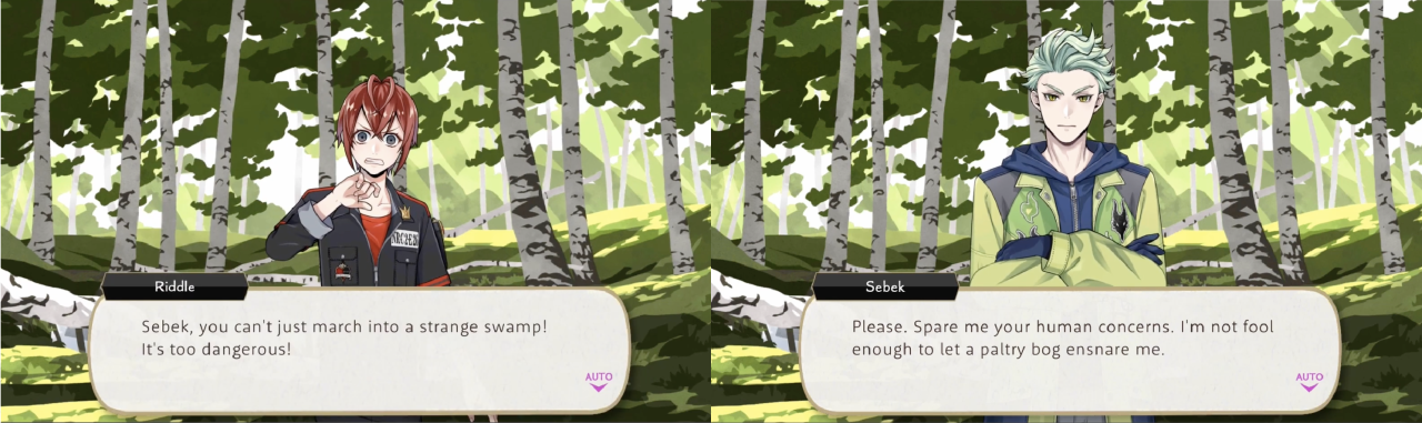 Sebek marches into a strange swamp despite Riddle’s warnings, saying, “Spare me your human concerns. I’m not fool enough to let a paltry bog ensnare me”, and argues against abandoning the camp during the Vargas-monster attack as, “that is clearly our worst option…basic deductive reasoning should’ve told you that.”
