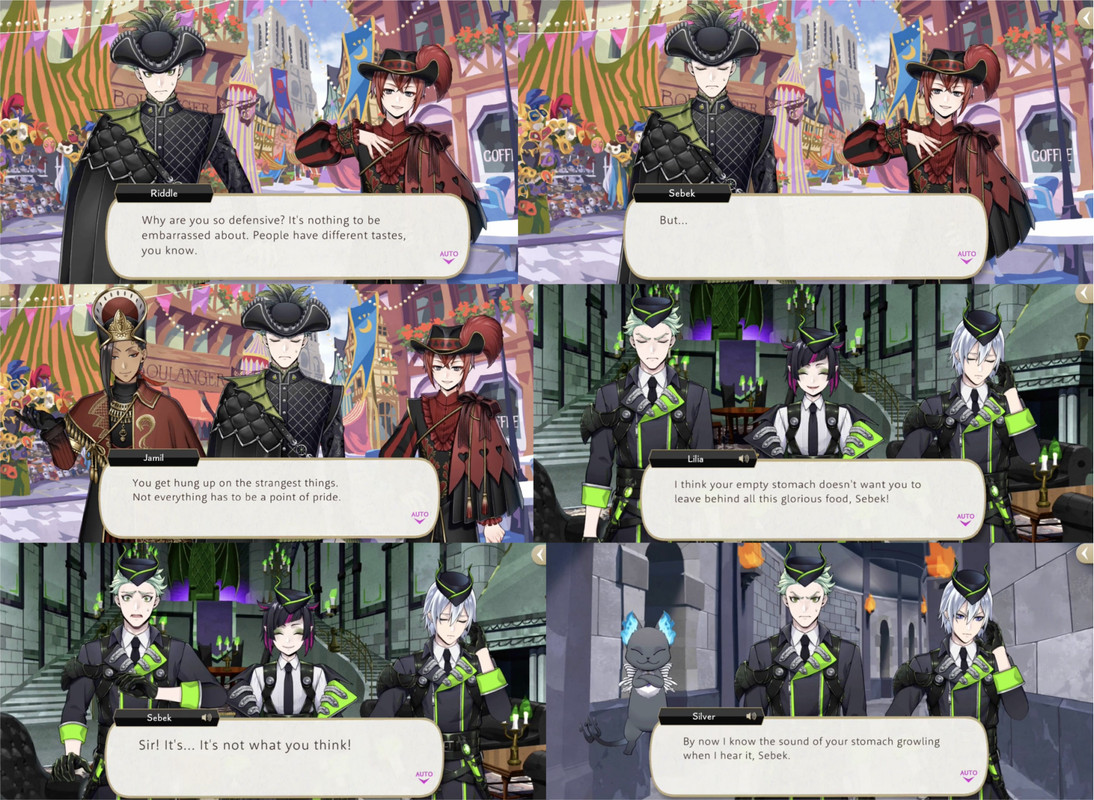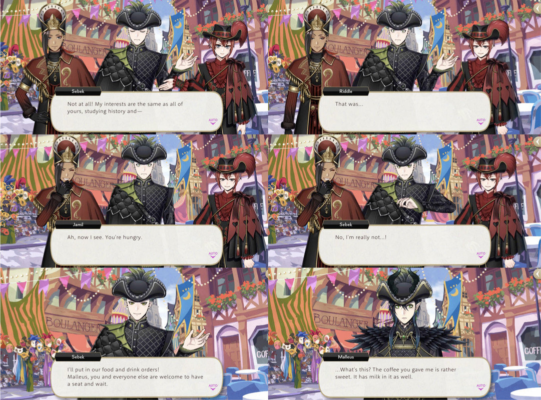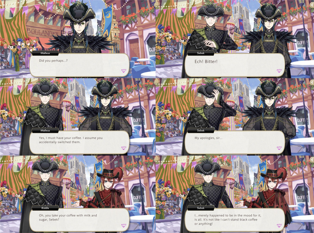 Other characters pick up on Sebek’s hidden insecurity during Glorious Masquerade when he refuses to admit that he prefers coffee with milk and sugar: Riddle asks why he is so defensive, saying it is nothing to be embarrassed about, while Jamil says “Not everything has to be a point of pride.”