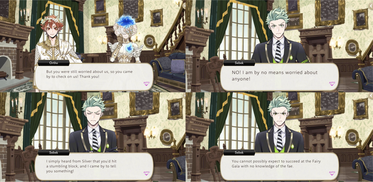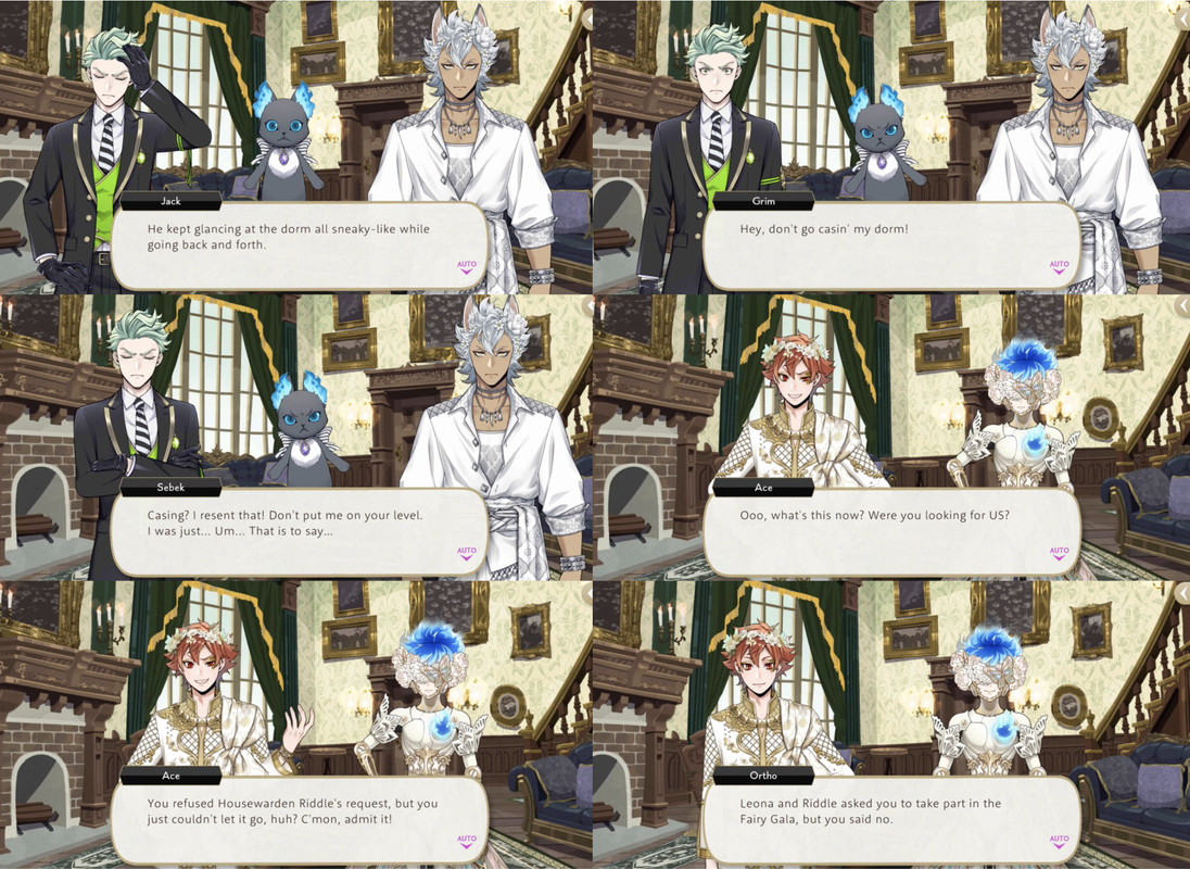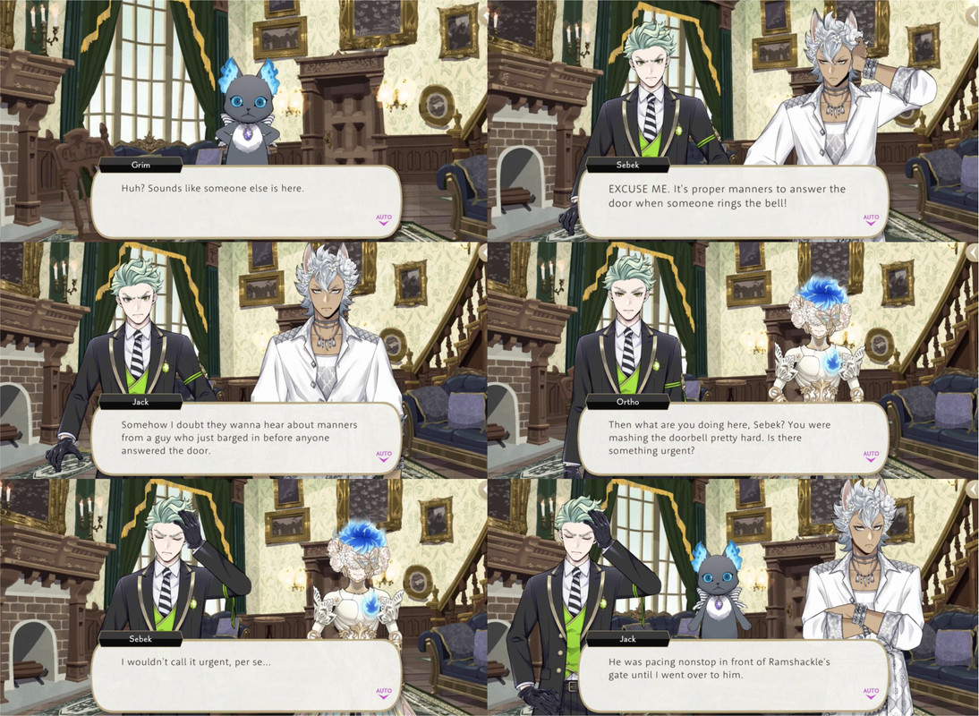 There is a similar example during Fairy Gala IF when Jack says he came across Sebek “pacing nonstop in front of Ramshackle’s gate…He kept glancing at the dorm all sneaky-like while going back and forth.”
