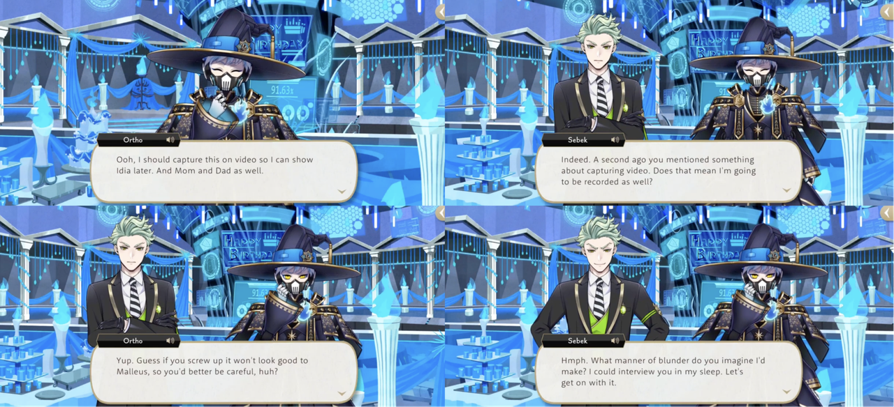 Ortho records his birthday interview for his family and teases Sebek, his interviewer, about making himself look bad on camera to Malleus.