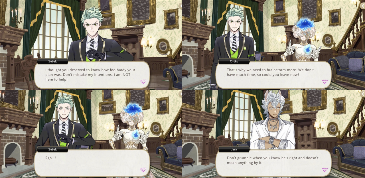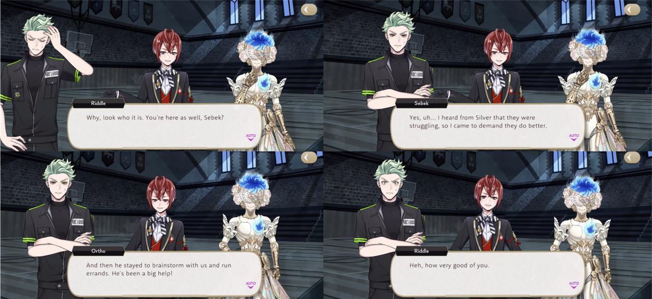 Riddle, too, comments on Sebek’s curious participation in the event (when Riddle requested his help at the start Sebek had soundly refused) and Sebek defends himself with, “I came to demand they do better.” This claim is undermined by Ortho’s follow-up that he has been brainstorming and running errands with them, making Sebek look uncomfortable.