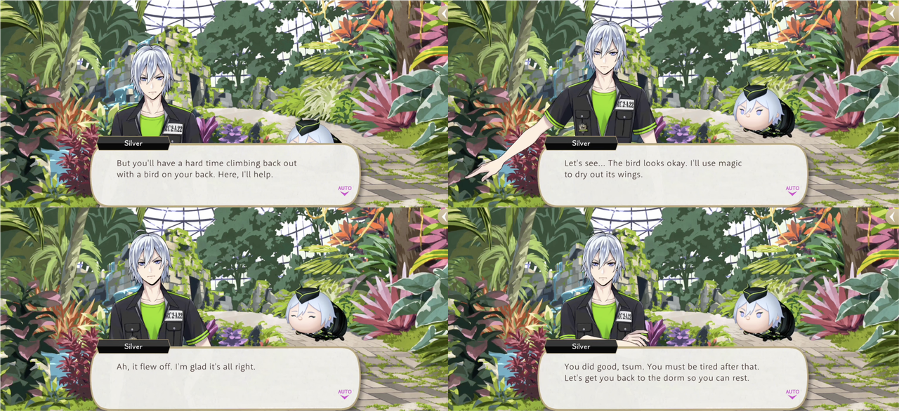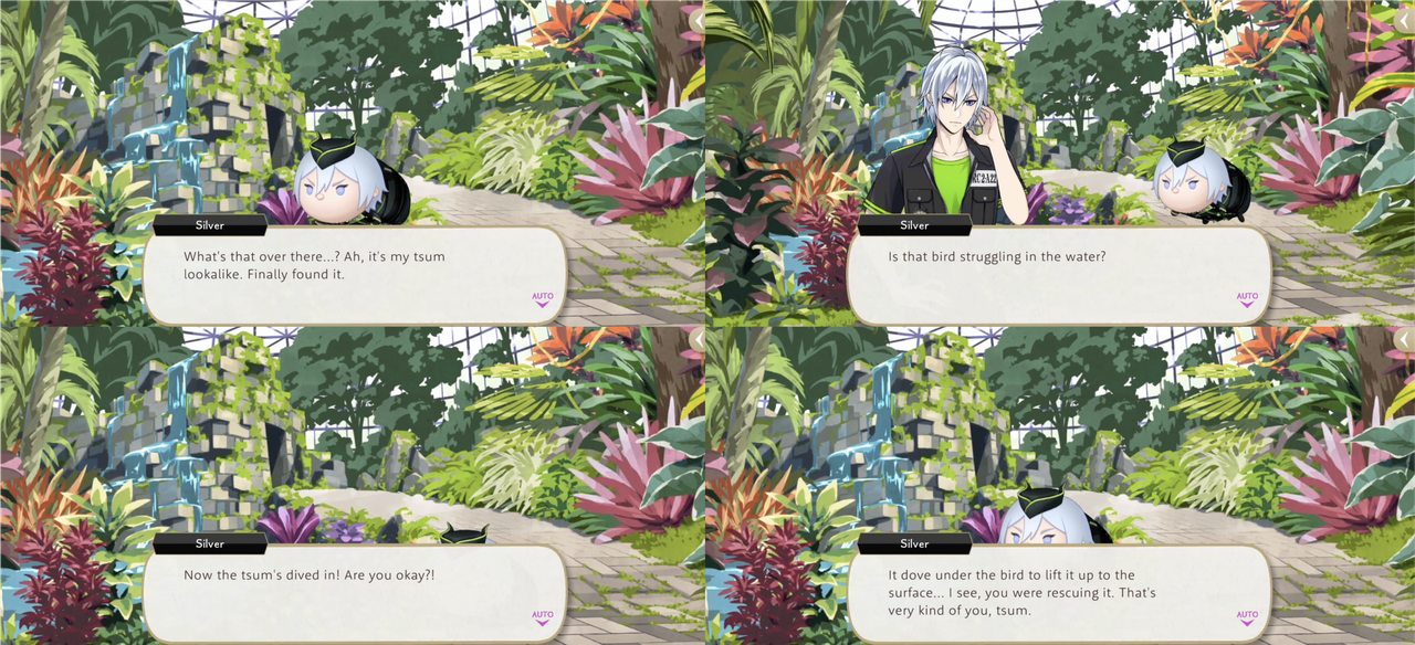 Silver is joined by birds in his bloom vignette, and his tsum finally wakes up during tsumsted in order to save a drowning bird. Silver also helps to rescue it, drying its wings off with magic.