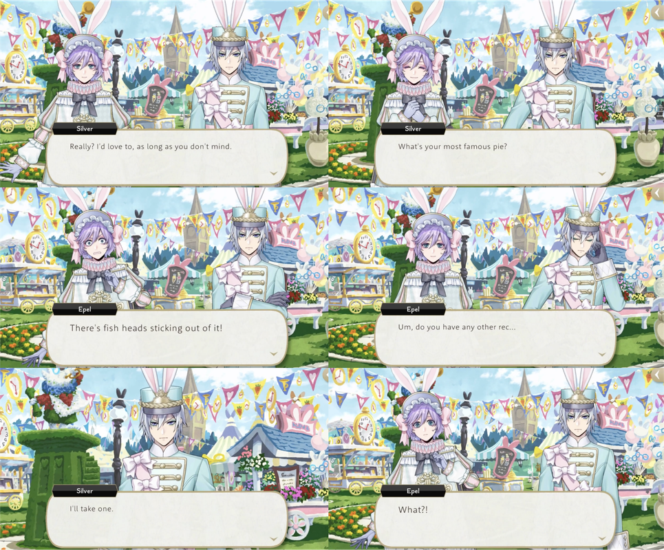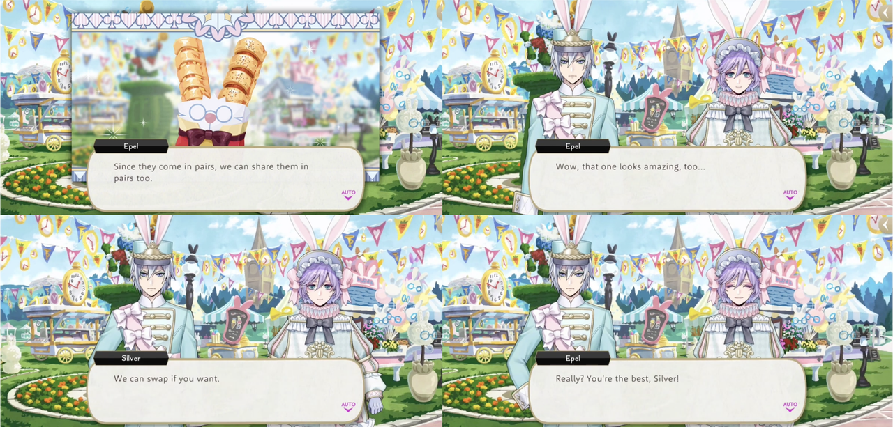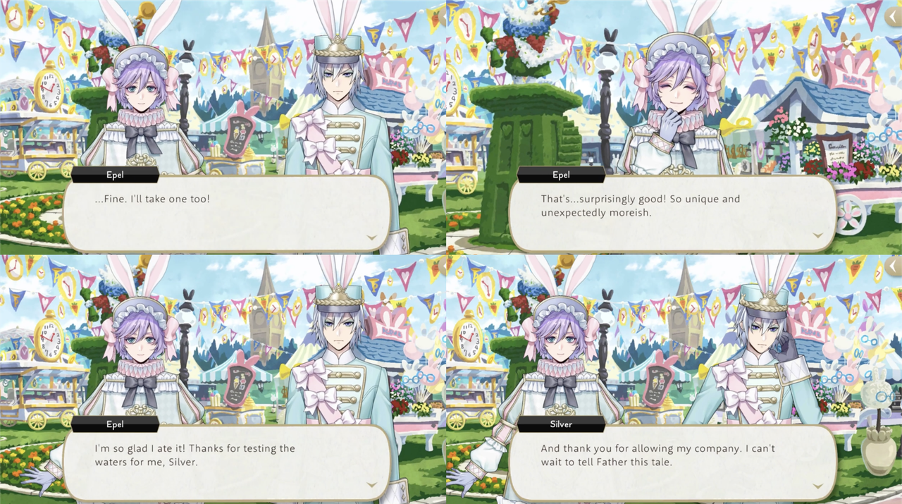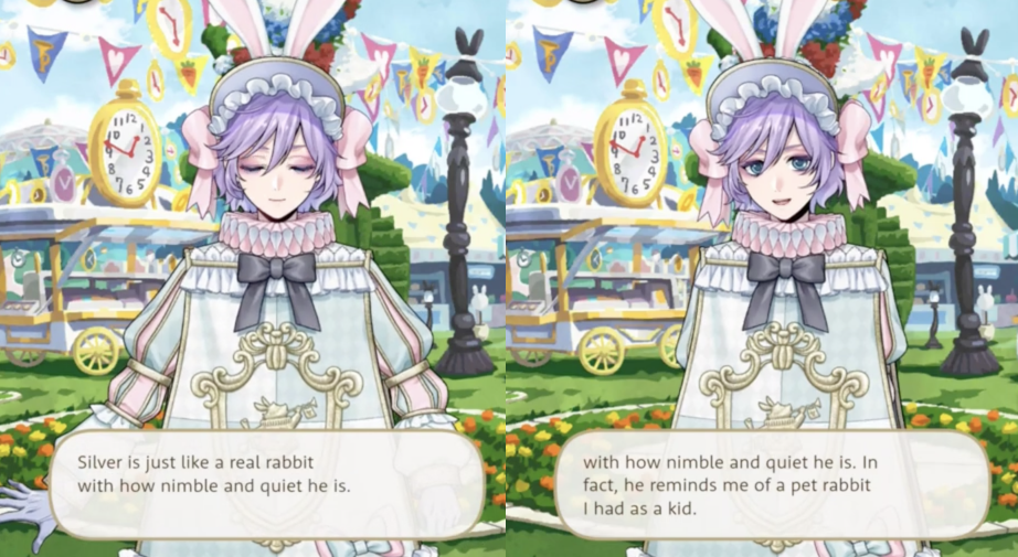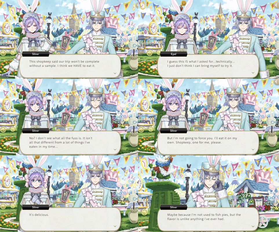Silver and Epel mostly overlap during the White Rabbit Fes event. Silver has a voice line of, “Epel seemed displeased when I called him cute. I must choose my words more carefully.” Epel says that Silver reminds him of his pet rabbit.