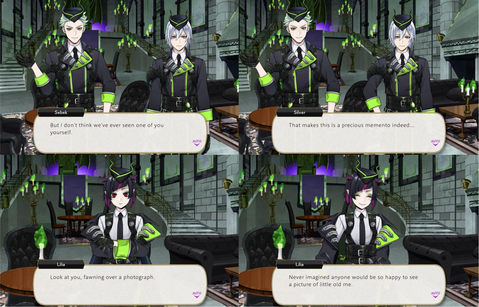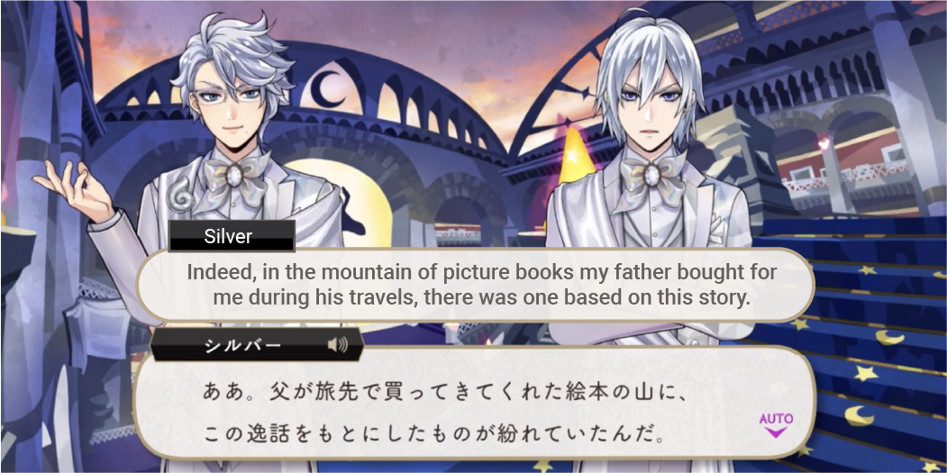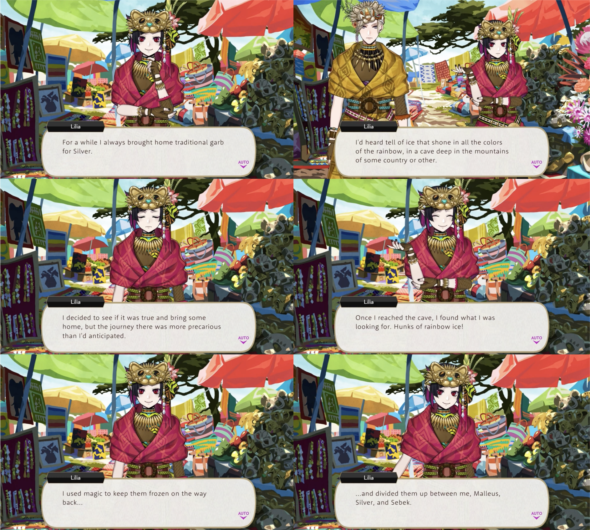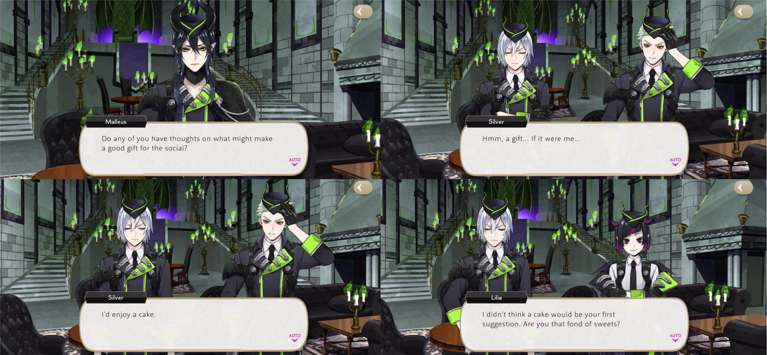 Rollo shows them a type of magic firework disguised as a handkerchief and, while Ruggie describes it as a kid’s toy (“Would it really be good for a dad?”), Silver says it will make a fine gift. Idia says that Silver’s dad “sounds like one playful dude” and Silver responds, “He is. A bundle of fun and cheer all around.”