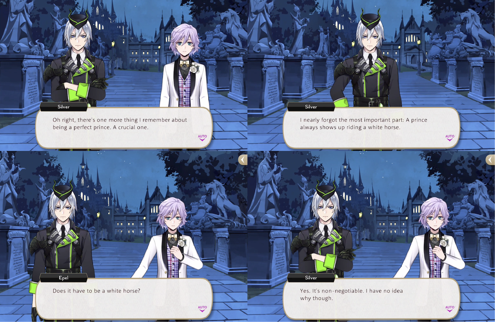 Other things Lilia has taught Silver include the requisites of being a perfect prince, such as joining a princess in song, having sparkling white teeth and riding a white horse. Lilia has also taught Silver that the secret to singing is to look at one’s own reflection in water (Idia is not convinced), which Silver says has helped him a lot.