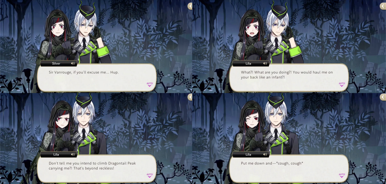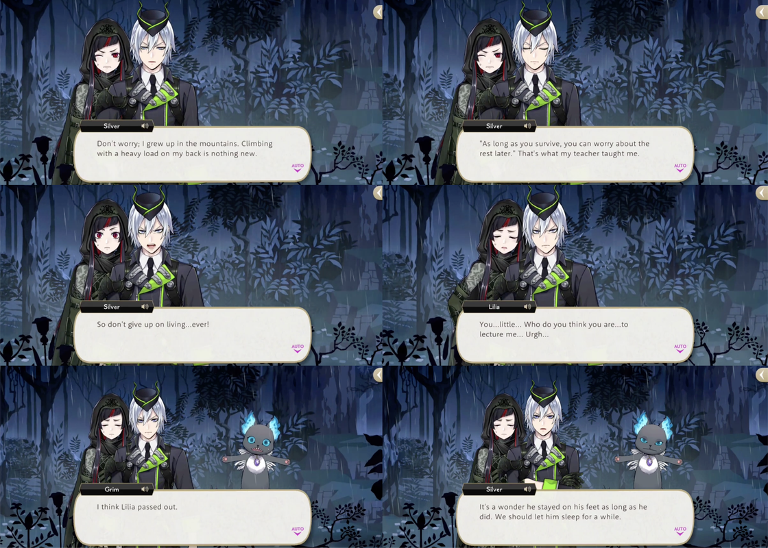 Silver ignores this request, instead hoisting Lilia onto his back. Grim comments on Silver’s impressive stamina, carrying Lilia up a mountain in the rain while battling back armored troops trying to kill him.