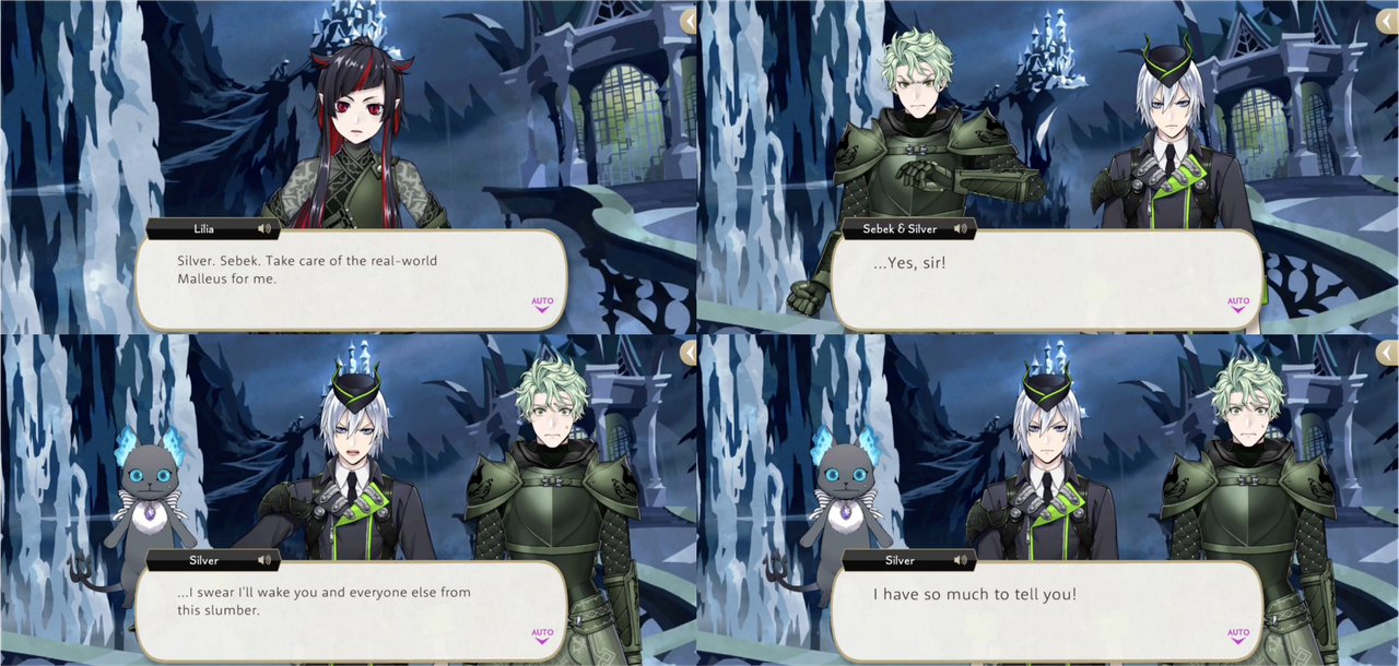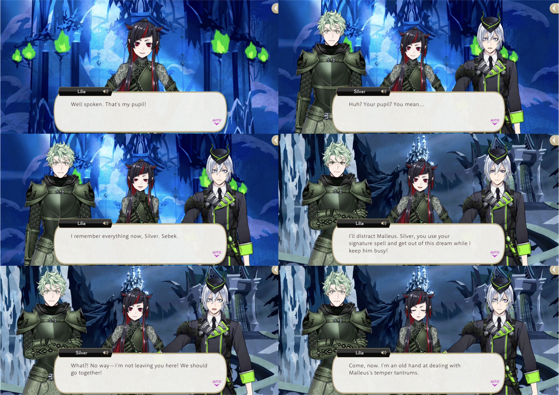 When Malleus appears in Lilia’s dream Silver declares that they will be crushing his blessing, which successfully awakens Lilia. Lilia sends Silver and the group away to distract Malleus on his own despite Silver’s insistence that they run away together, asking them to take care of the real-world Malleus on his behalf.