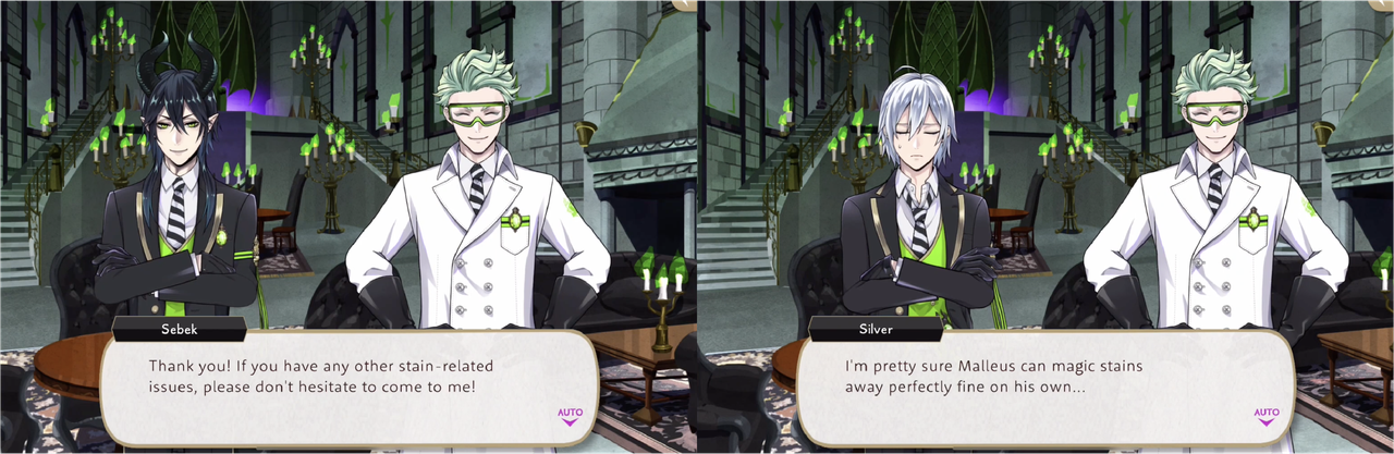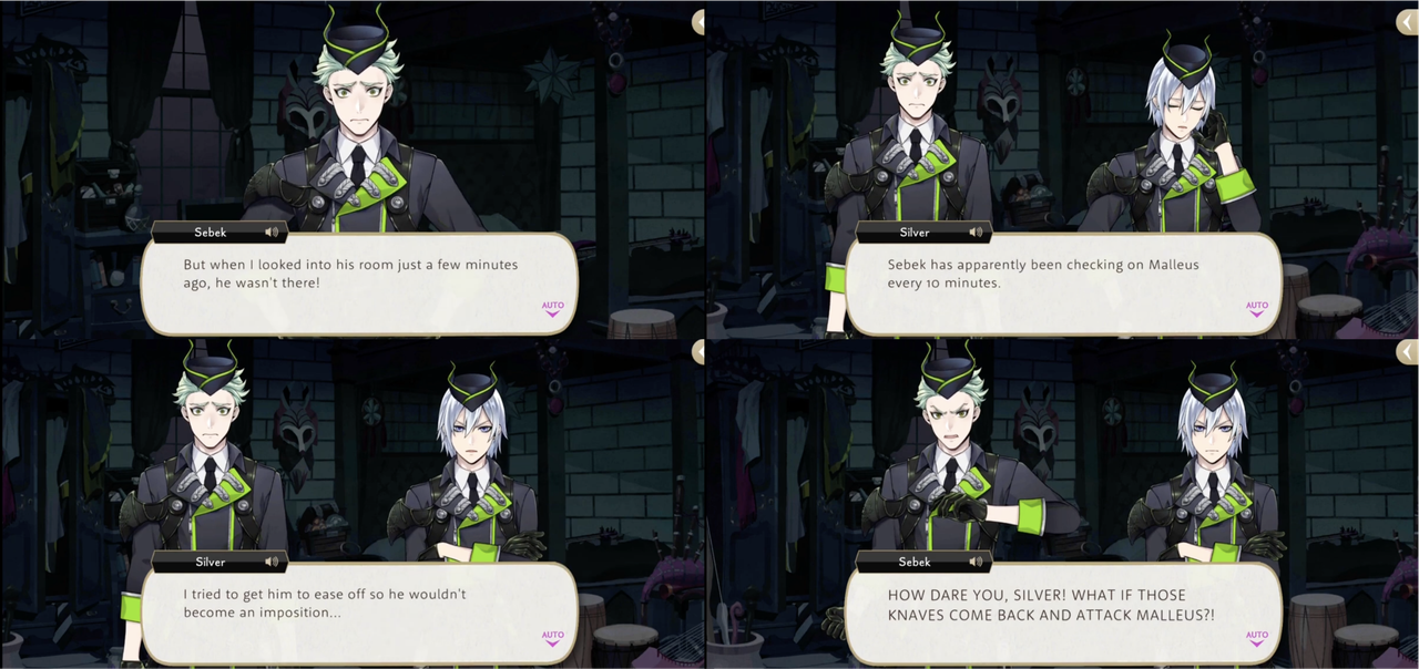 Silver expresses exasperation about Sebek’s insistence to do things like handle clothing stains on Malleus’ behalf despite Malleus being perfectly capable of such simple feats of magic.