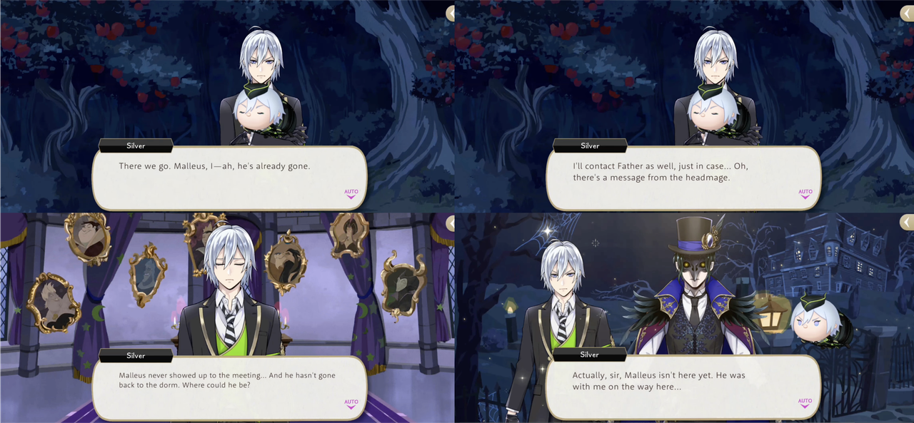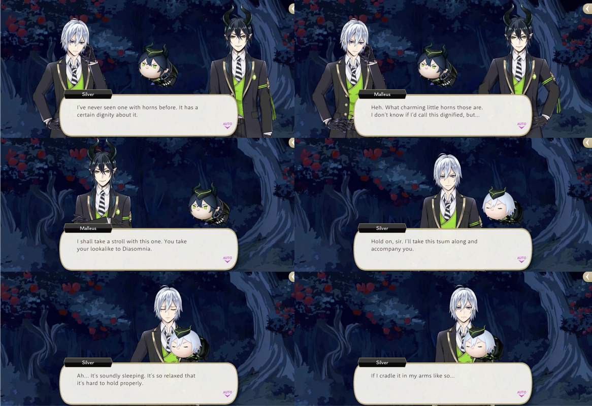 Silver and Sebek also lose sight of Malleus during the Glorious Masquerade social, and despite Silver reassuring Malleus that he will accompany him on his stroll around campus with his tsum, by the time Silver has figured out how to carry his own tsum along with him Malleus has disappeared.