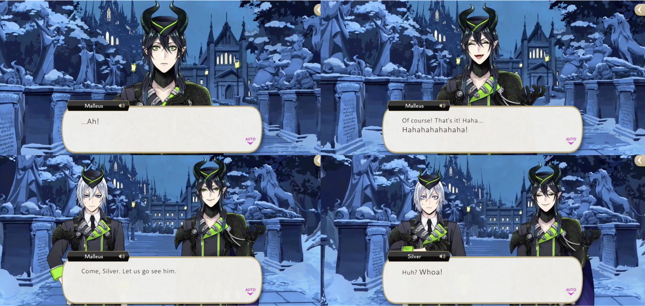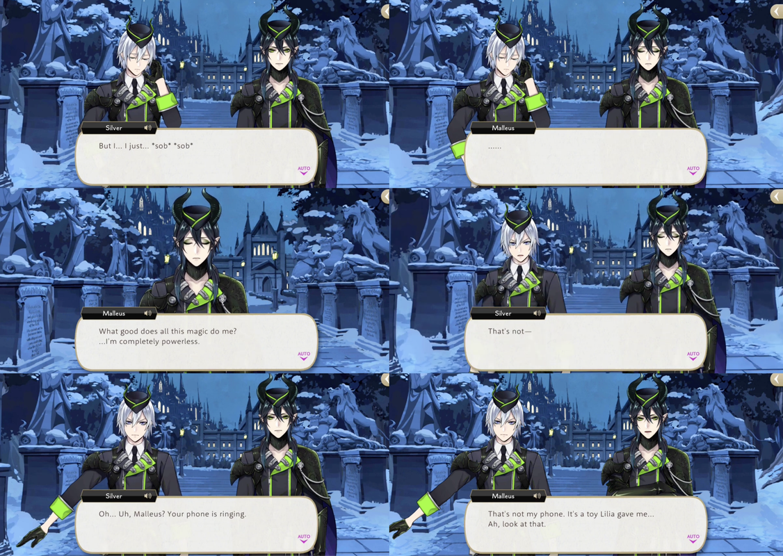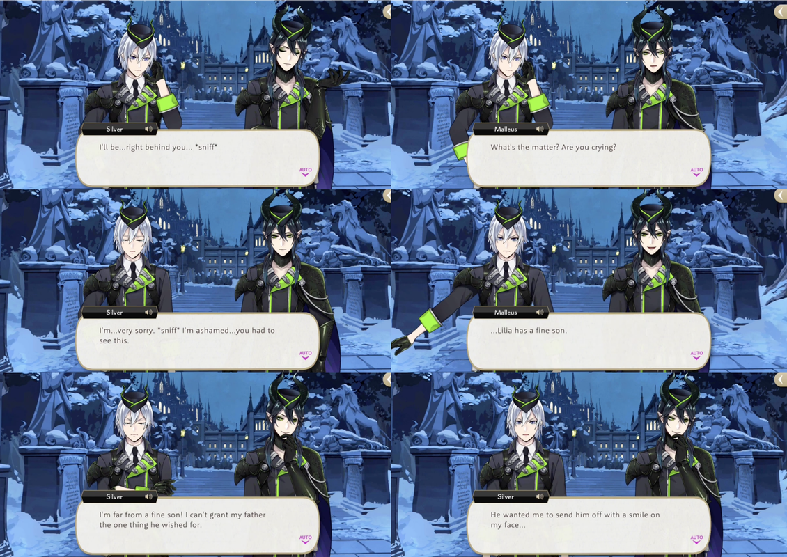 Silver reflects on how he has only known Lilia for 17 short years compared to how long Malleus and Lilia have been together. Malleus concedes to Silver’s request and actually agrees to attend the party, but Silver tries to send Malleus back alone, as he has begun to cry. Silver apologizes for crying in front of Malleus but Malleus assures him that “Lilia has a fine son.”