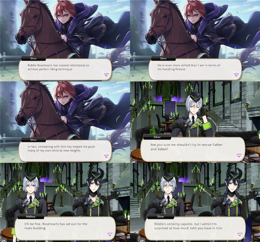 Silver respects Riddle’s horseback-riding abilities as well, saying that Riddle is even more skilled than he is in terms of handling finesse and that competing with Riddle has helped him improve (but he expresses surprise at Malleus’ trust in Riddle’s abilities during Phantom Bride).