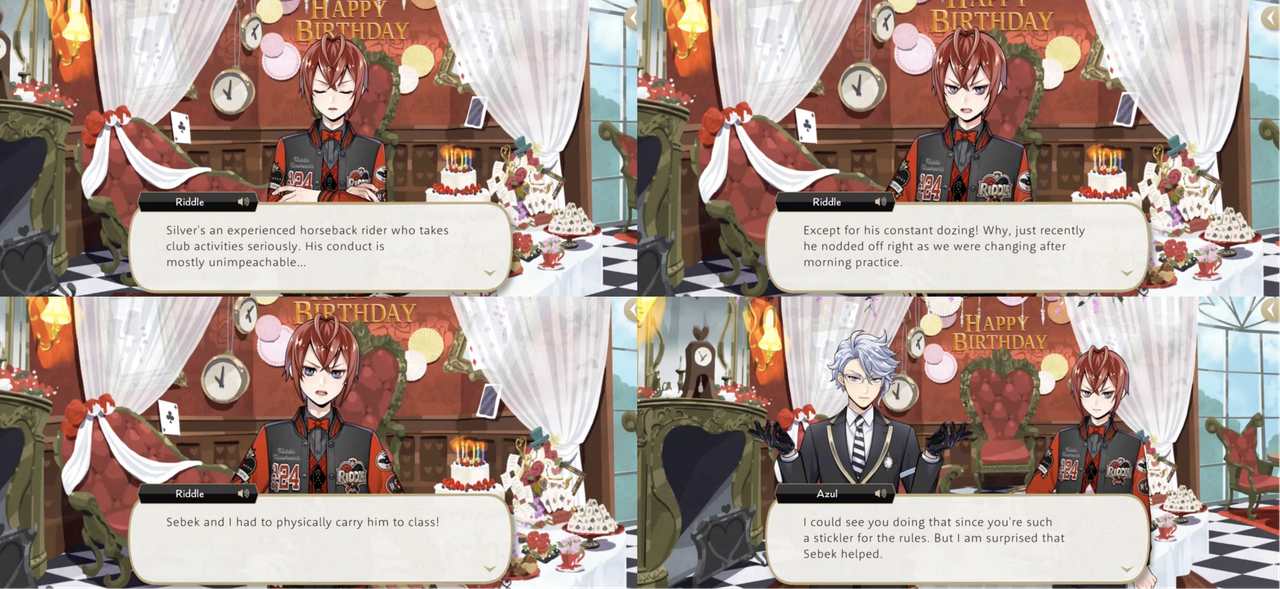 In a birthday vignette Riddle says that while he respects Silver’s horseback riding skills and his conduct is mostly unimpeachable, he cannot stand Silver’s habit of suddenly falling asleep, recounting a time that he and Sebek had to carry a sleeping Silver to his next class.