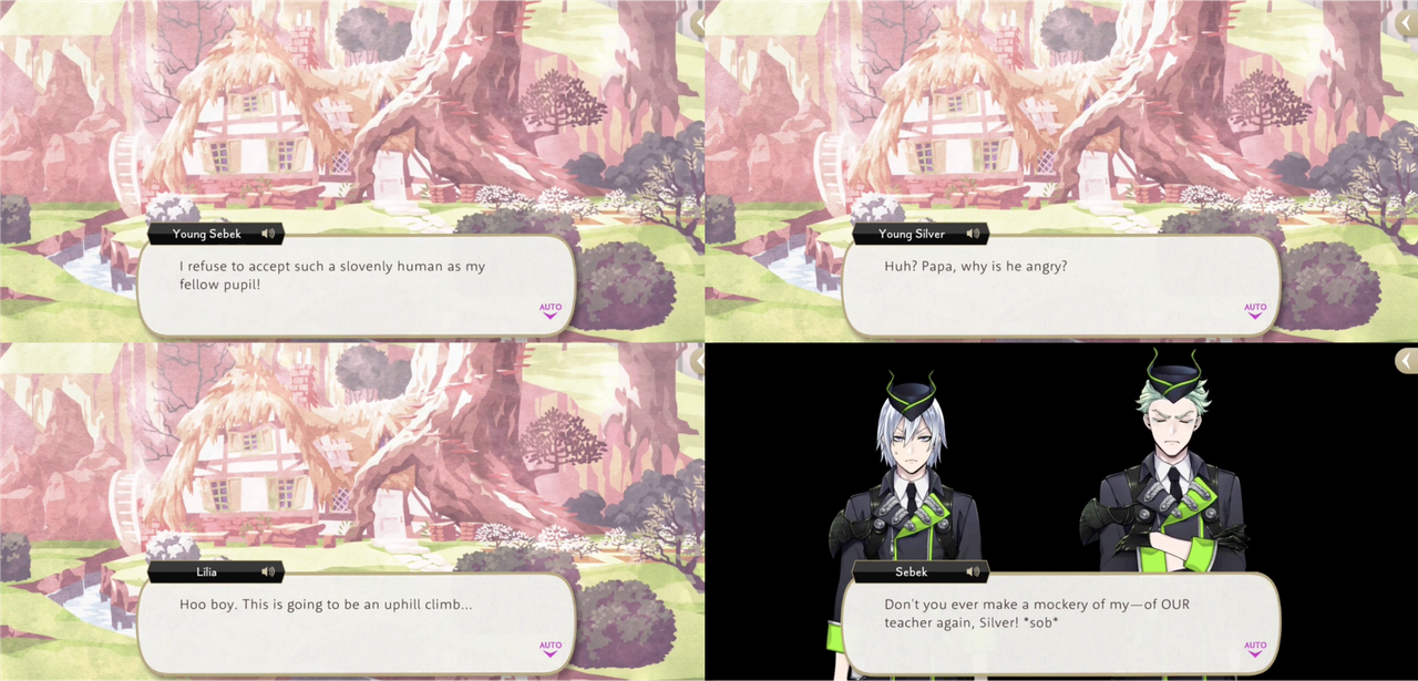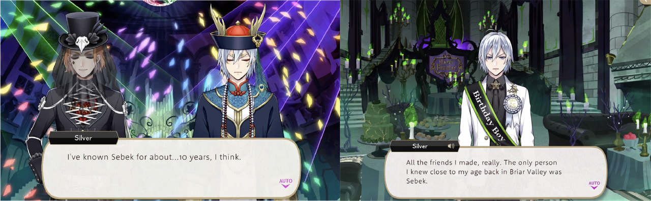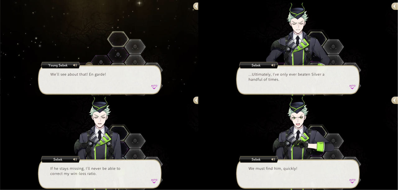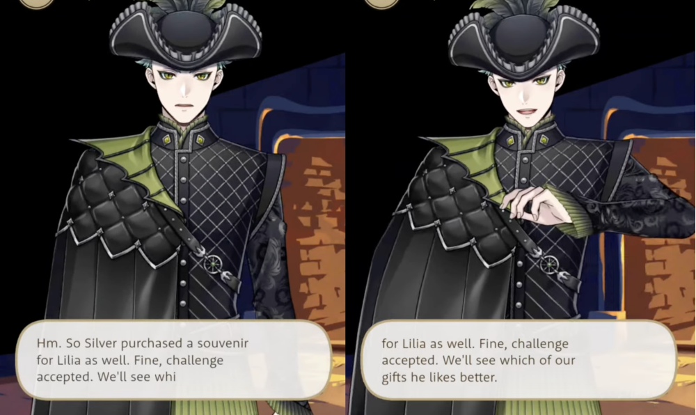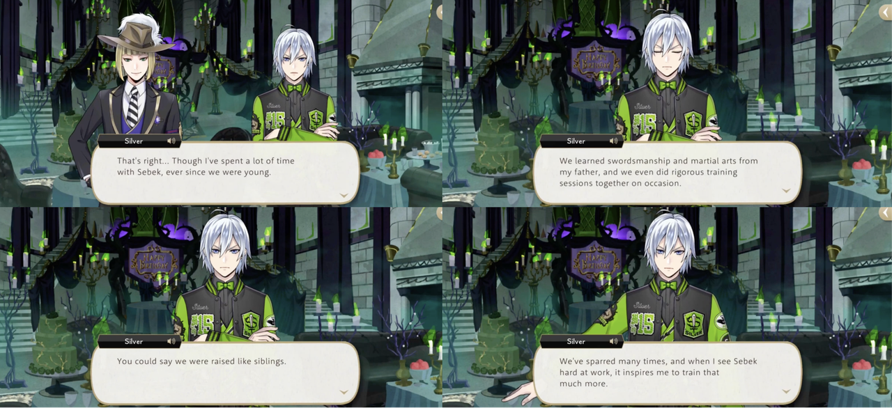 Sebek has a voice line of, “So Silver purchased a souvenir for Lilia as well. Fine, challenge accepted. We’ll see which of our gifts he likes better,” and it seems they have been raised to be in competition with one another from early on: Sebek sees a flashback from when they would spar together as children where Silver won a point against him, and Sebek demanded a rematch.