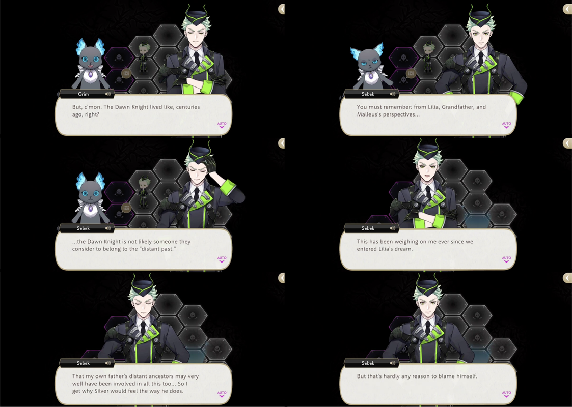 Grim asks, “How’re you ever supposed to sleep at night if you worry about stuff from the way distant past?” and Sebek explains that the Dawn Knight isn’t in the “distant past” to people as long-lived as Lilia, Malleus and his grandfather, and he understand why Silver would feel the way he does, as his own father’s distant ancestors were possibly involved in the near-eradication of the fae, as well. “But,” Sebek says, “that’s hardly any reason to blame himself.