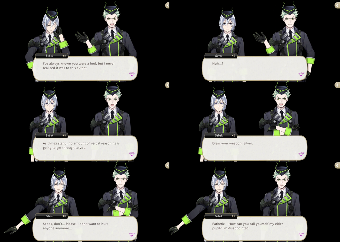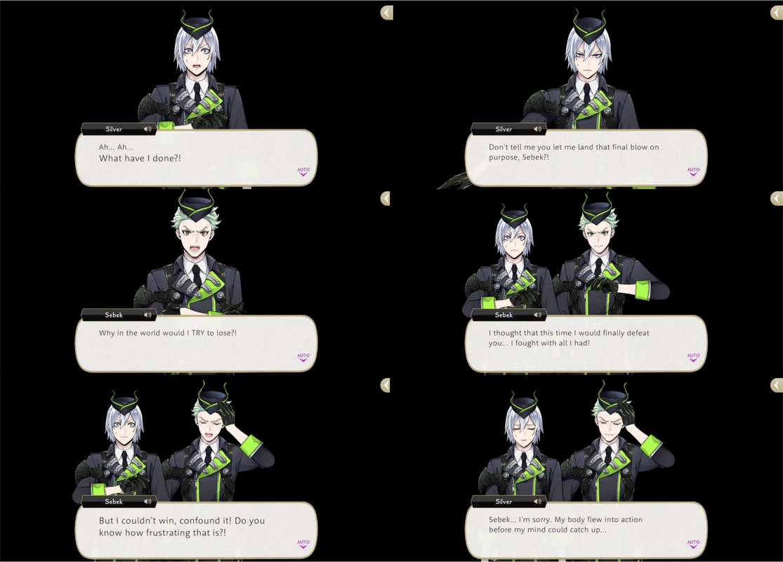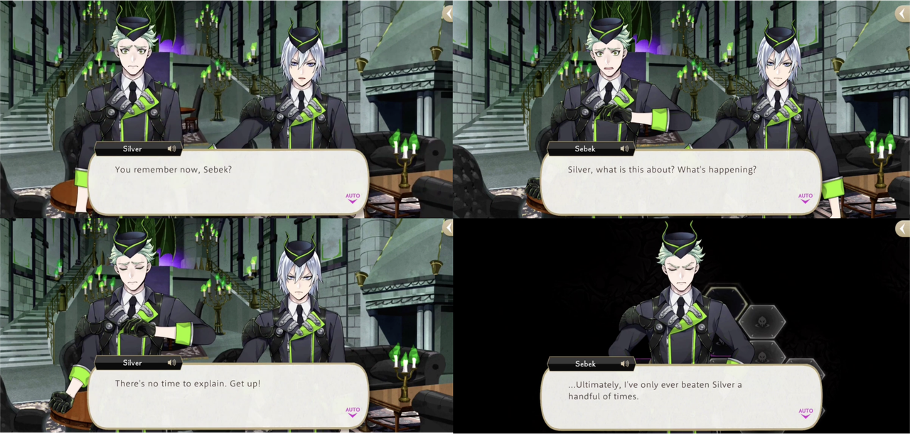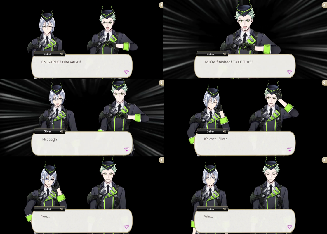 Silver refuses, saying that he doesn’t want to hurt anyone anymore, but Sebek insists: “So be it. I’m going to knock some sense into you before you disgrace yourself any further!” (Silver: “All right. If that… makes you feel better…”)