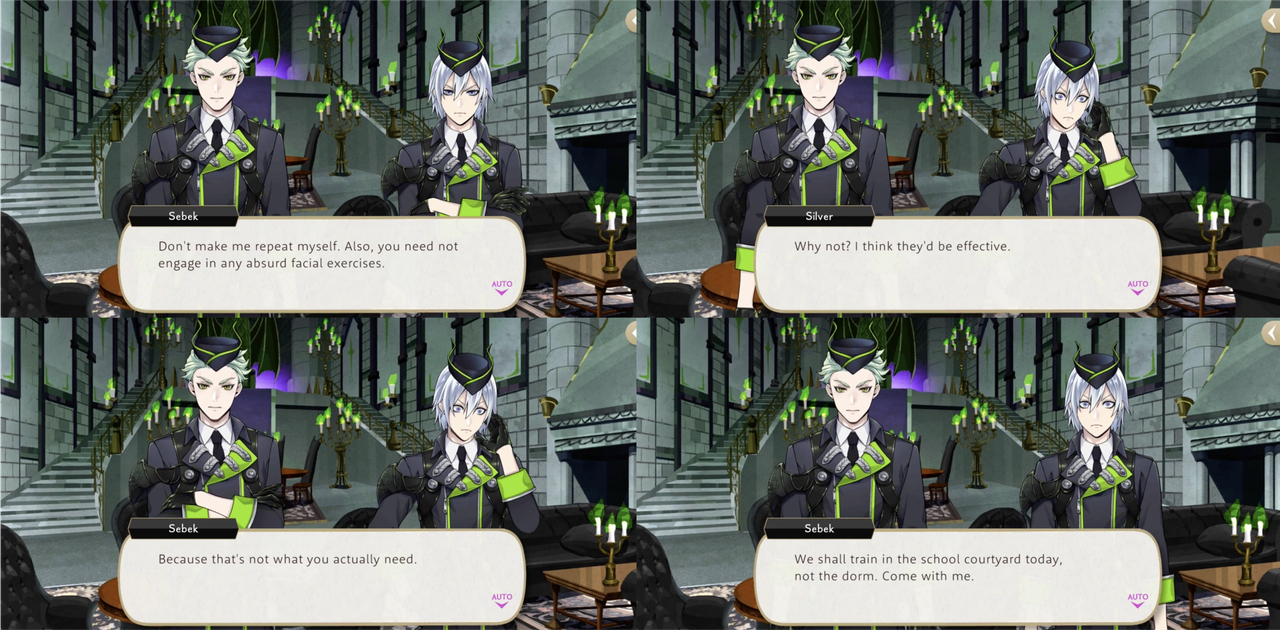 Sebek reluctantly decides to assist him, inviting him to practice their swordsmanship in the school courtyard: “You need not engage in any absurd facial exercises…because that’s not what you actually need.”