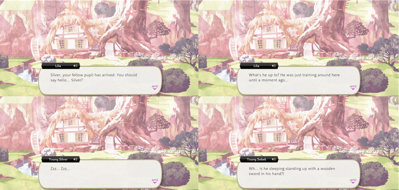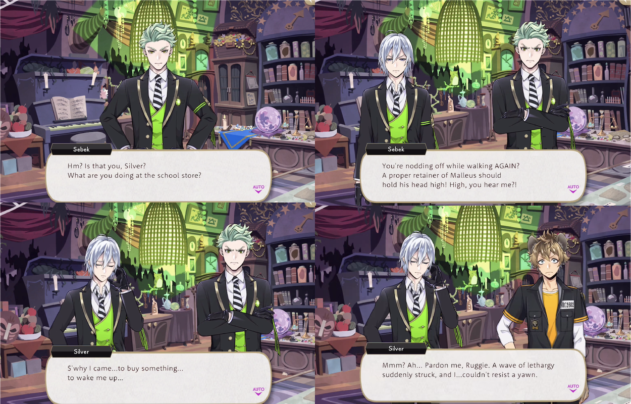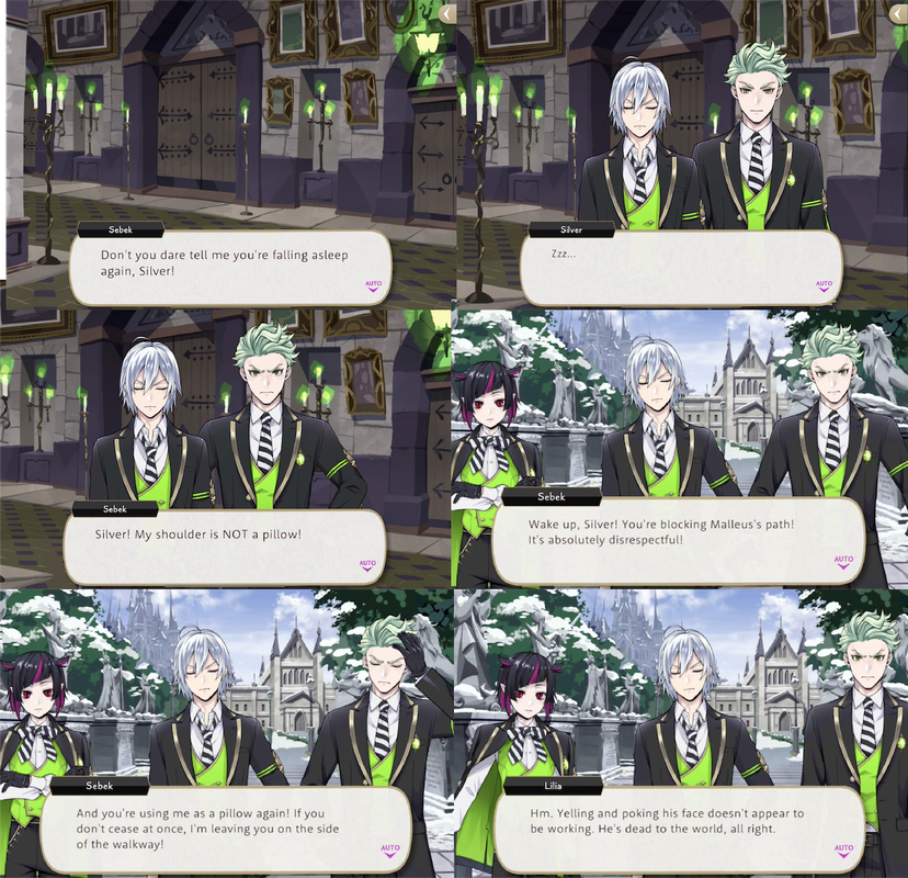 We see a flashback from Silver’s childhood where he is sleeping while “standing up with a wooden sword in his hand” for his first introduction to Sebek, and another where Sebek chides him for “lazing about” in Malleus’ presence (Silver had fallen asleep).