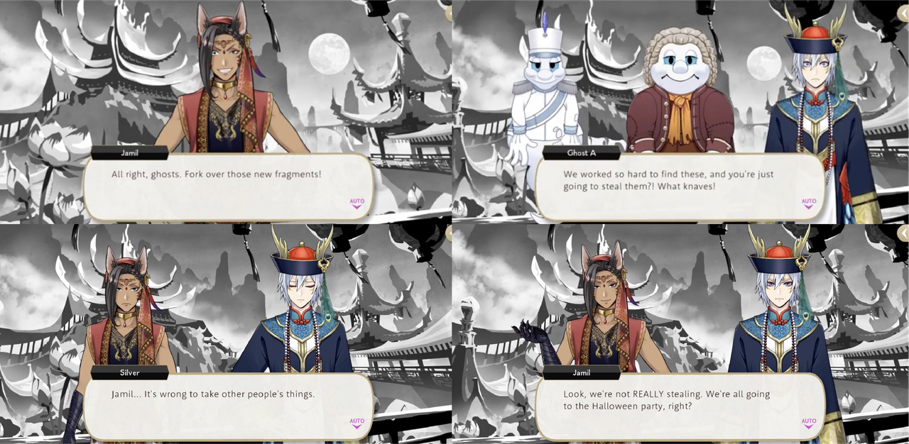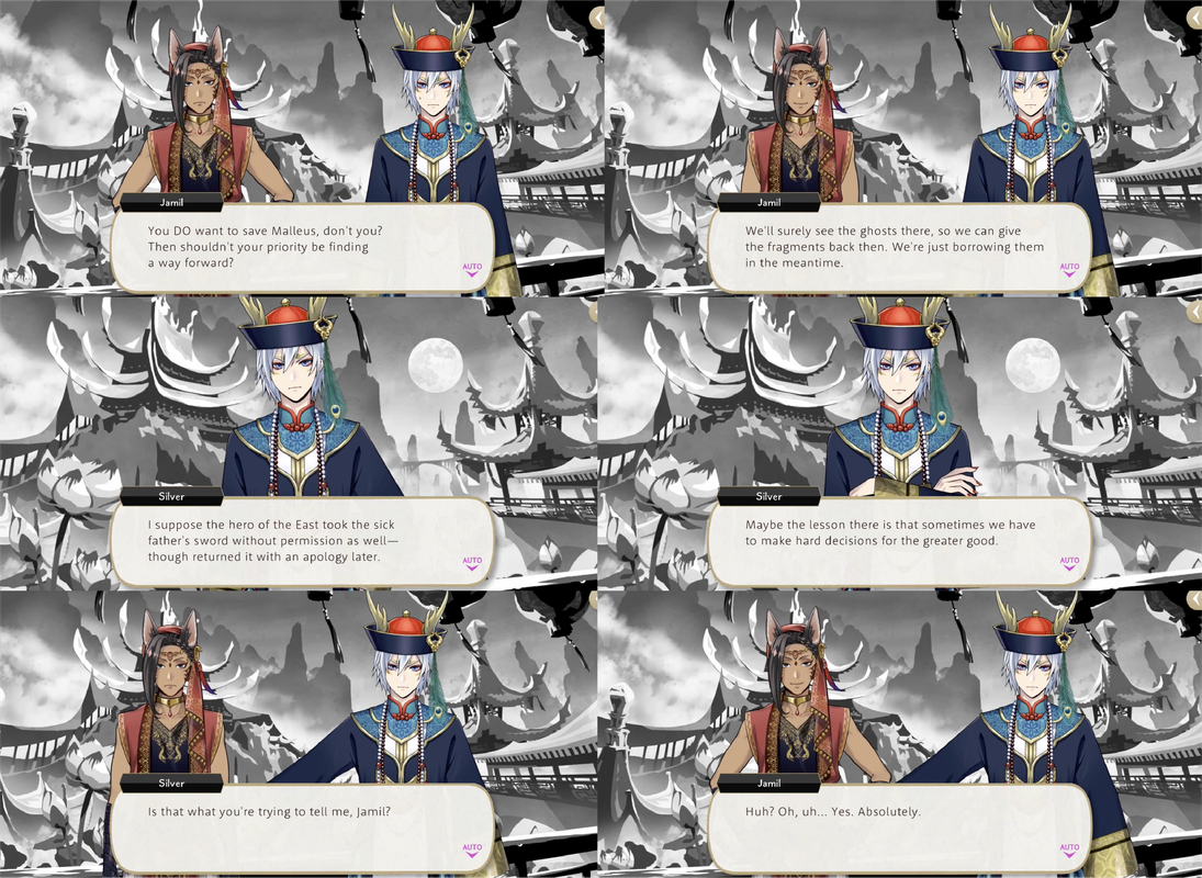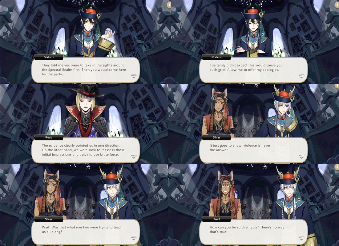 After stealing mirror fragments from ghosts during Spectral Soiree (“Silver: Jamil… It’s wrong to take other people’s things”) Jamil says that they are not REALLY stealing, but borrowing, and reminds Silver that he is trying to save Malleus.