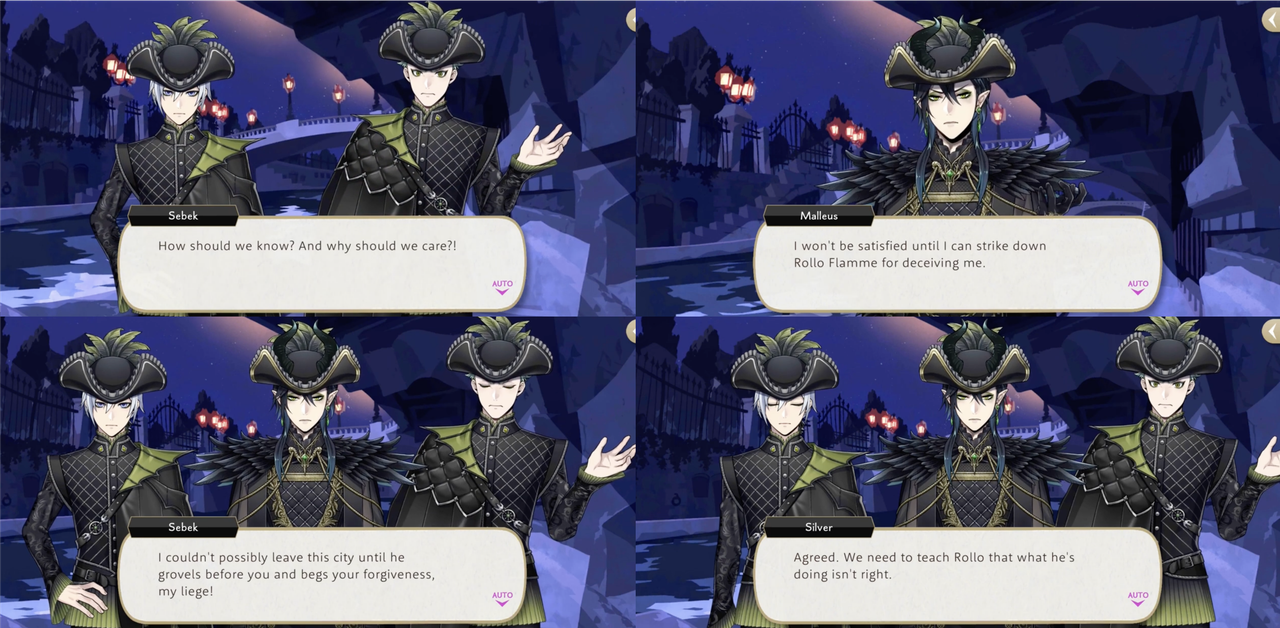 Malleus declares that he will not be satisfied until he can strike Rollo down and Sebek agrees, saying that they cannot leave until he grovels and begs for Malleus’ forgiveness. Silver follows with, “Agreed. We need to teach Rollo that what he’s doing isn’t right.”