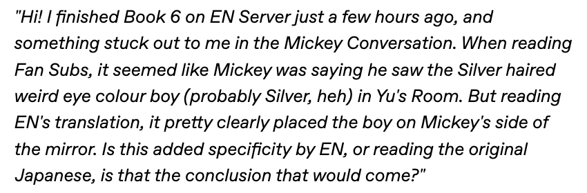 The idea that Silver was in the prefect’s room is further debunked by Mickey’s follow-up line, when he says that he wishes the prefect could also come to see him on “this side” (こっち側/kocchigawa), just like Silver did.