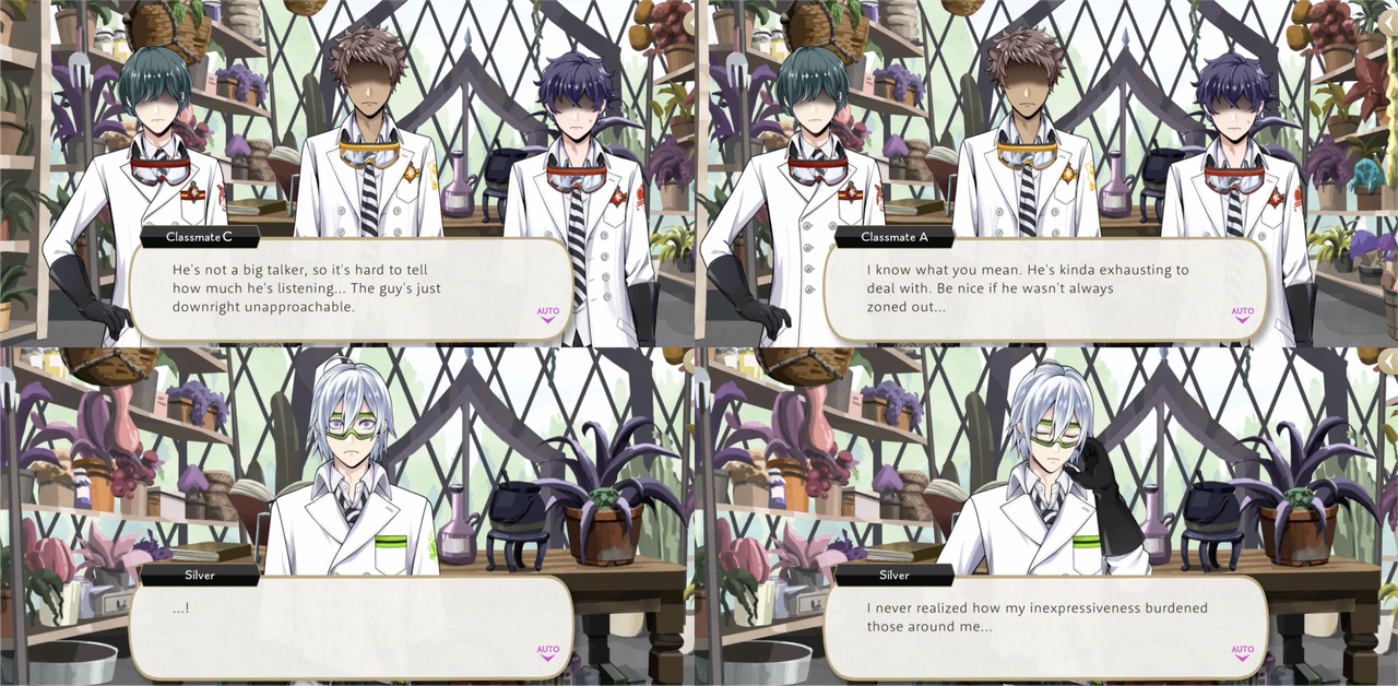 Silver’s dorm vignette is based around his inability to portray his emotions through his facial expressions, with students in his class gossiping about how they can never tell if he is angry or happy. Silver overhears them talking about how they are not sure if he even has emotions, how unapproachable he is, and how he is “kinda exhausting to deal with.”