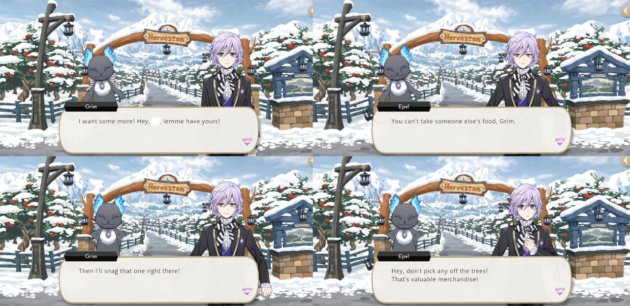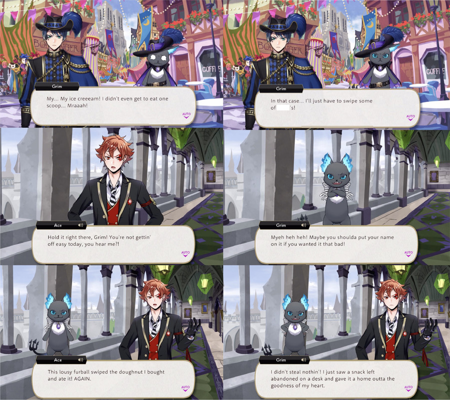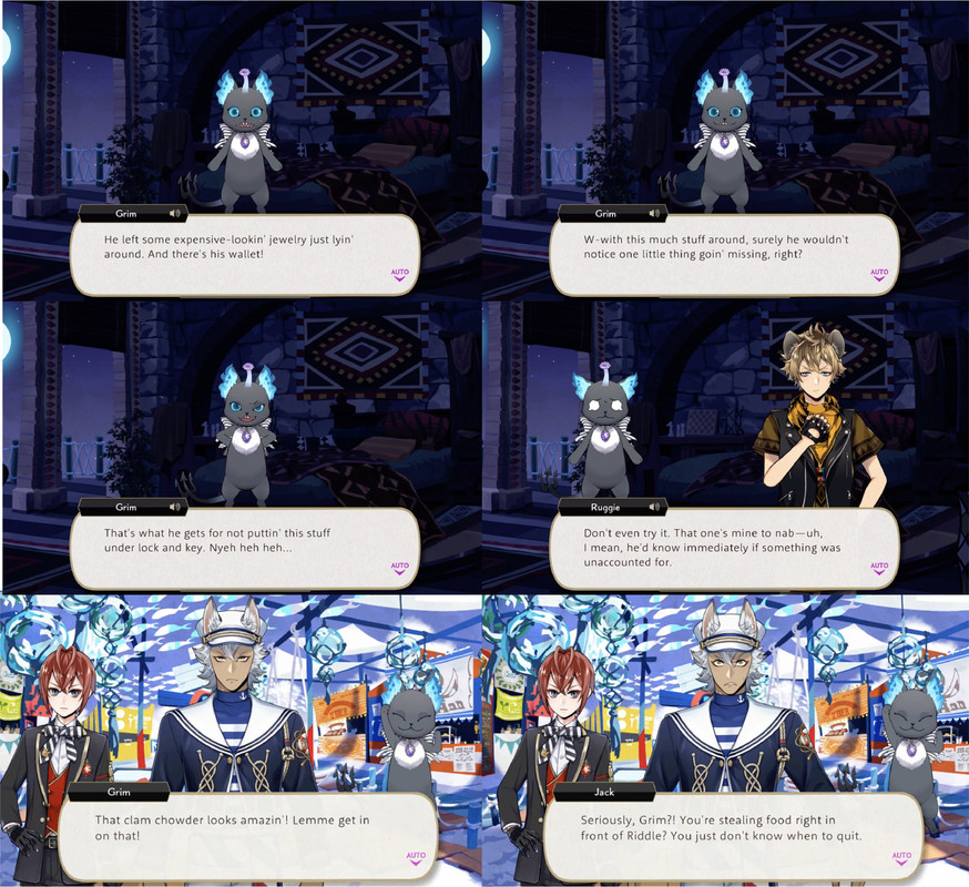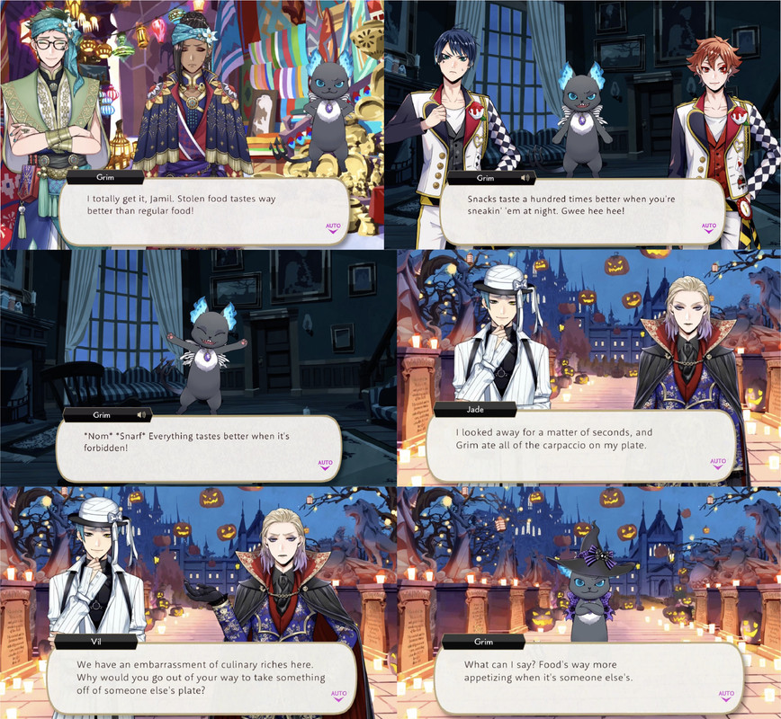 Grim steals carpaccio from Jade’s plate during Halloween (“Food’s way more appetizing when it’s someone else’s”), tries to take an apple from the prefect, decides to take apples from a farmer when Epel tells him no, goes after the prefect’s ice cream during Glorious Masquerade, steals a doughnut from Ace, clam chowder during Port Fest and hints at wanting to steal jewelry from Leona.