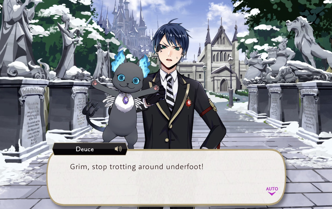 Grim asks the prefect to hold him for a picture, Deuce has a line about him “trotting around underfoot” and Grim asks Cater to lower his phone so that he can see the screen, which all may insinuate that he might just be walking around