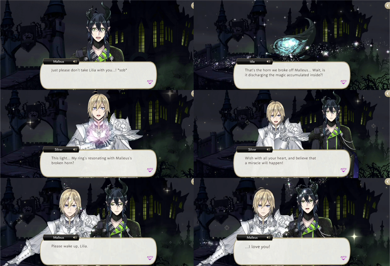 Malleus’ broken horn begins to discharge the magic it has accumulated, with Silver’s ring resonating with it. Silver and Malleus come together to wish for Lilia to come back to life, and he does.