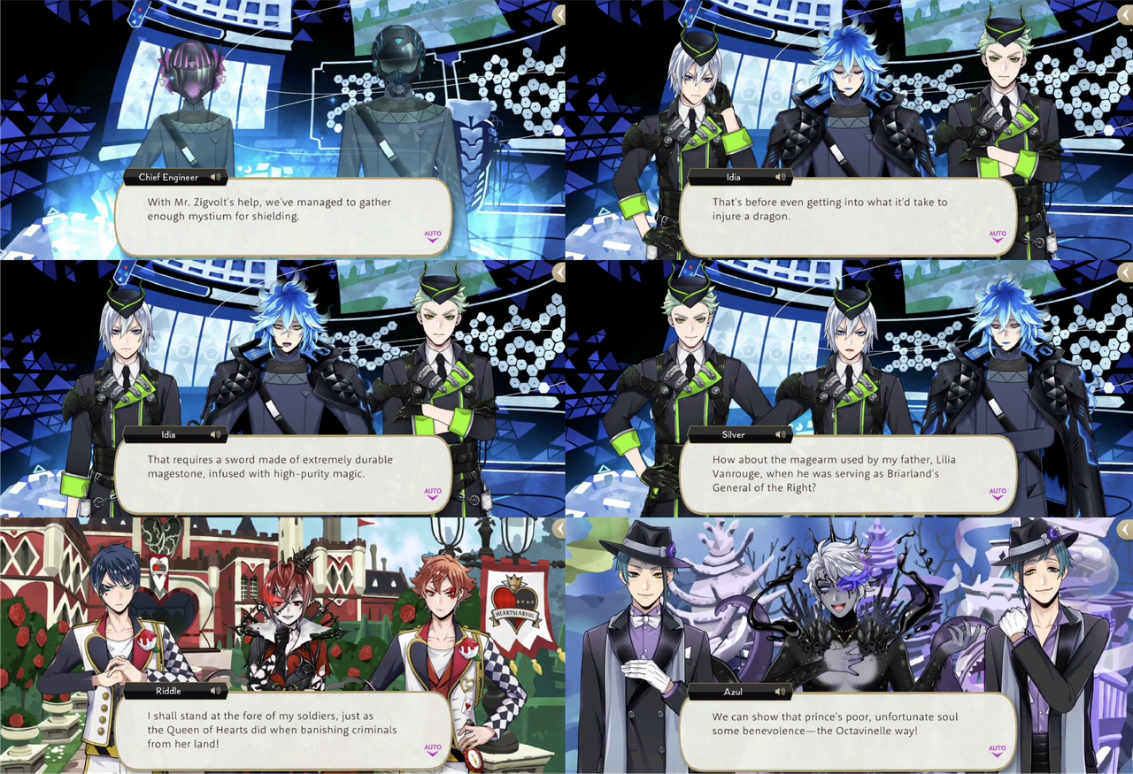 Idia summons the rest of the characters, minus Lilia, equipping Riddle, Leona, Azul, Jamil, and Vil with special equipment that makes them the most powerful version of themselves: their overblot forms.