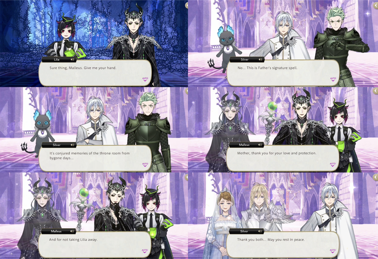 Malleus and Lilia combine their magic to conjure memories of the throne room of Meleanor’s castle. Malleus thanks the apparition of his mother for not taking Lilia away, and Silver also thanks his own parents.
