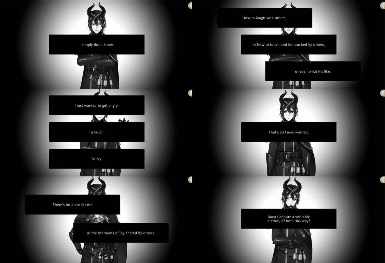 Malleus reflects on how he does not know how to laugh with others, to touch or be touched, and he wants to be allowed to feel emotions, with the blessings he has been given actually being a curse.