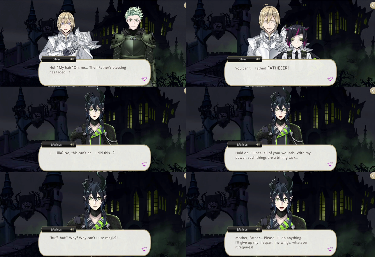 Malleus sees a vision of Lilia saying that it is time for him to go, and wakes up to a broken horn and himself having killed Lilia on accident, but he can no longer summon enough magic to heal Lilia’s wounds.