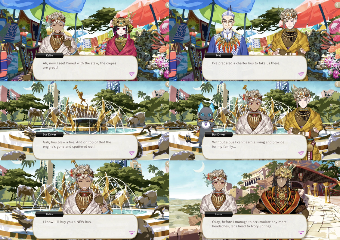 Leaving Kifaji at the royal palace, Leona drives the group in a car to a local hot springs resort.