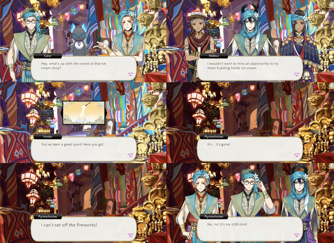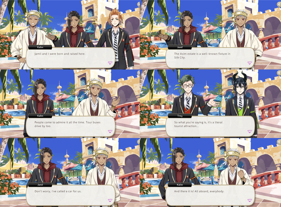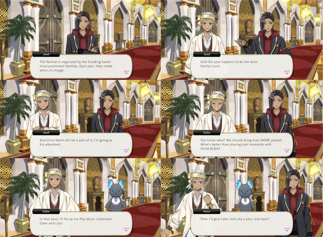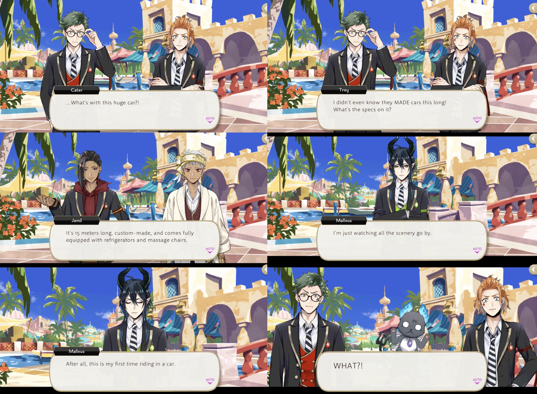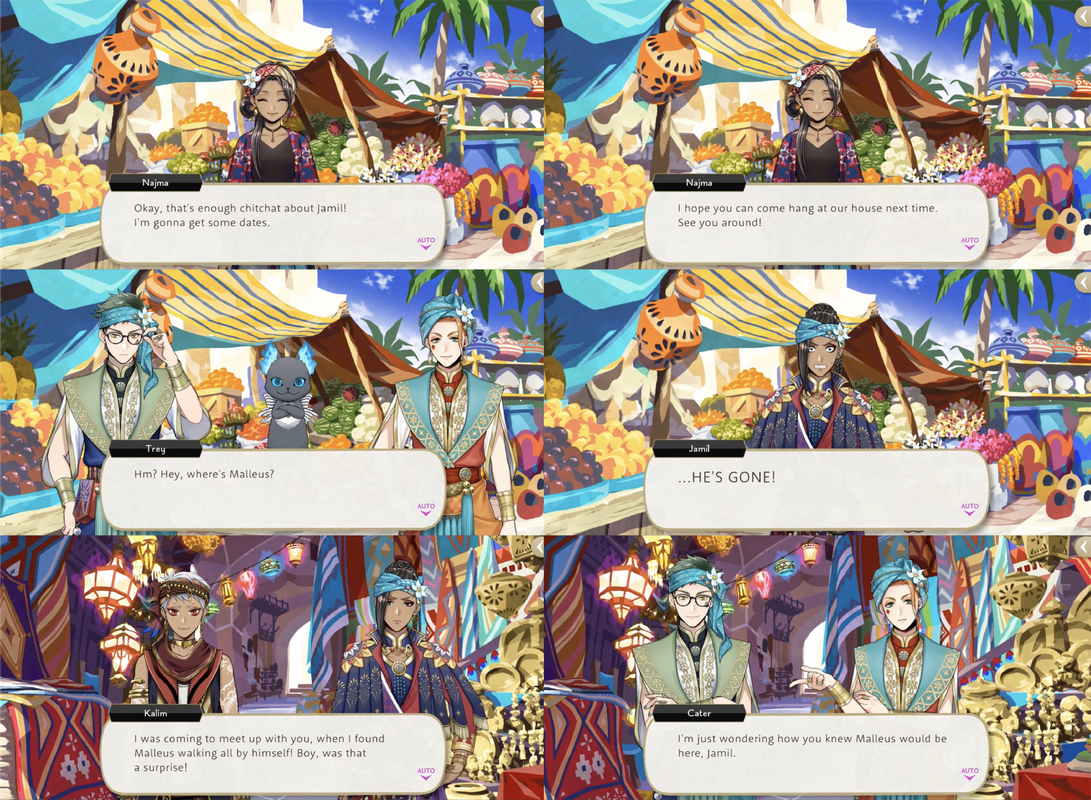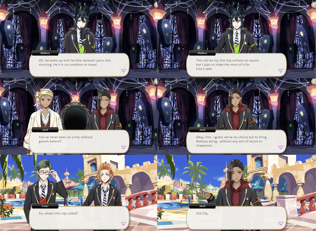 Kalim invites the pop music club, Cater and Lilia. Cater invites Trey and but Lilia has a stomach ache on the day of the event, sending Malleus alone in his place, for Malleus’ first trip without an escort. Jamil reluctantly concedes and the group travels to Silk City, where he and Kalim were born and raised.