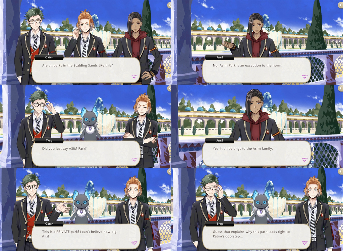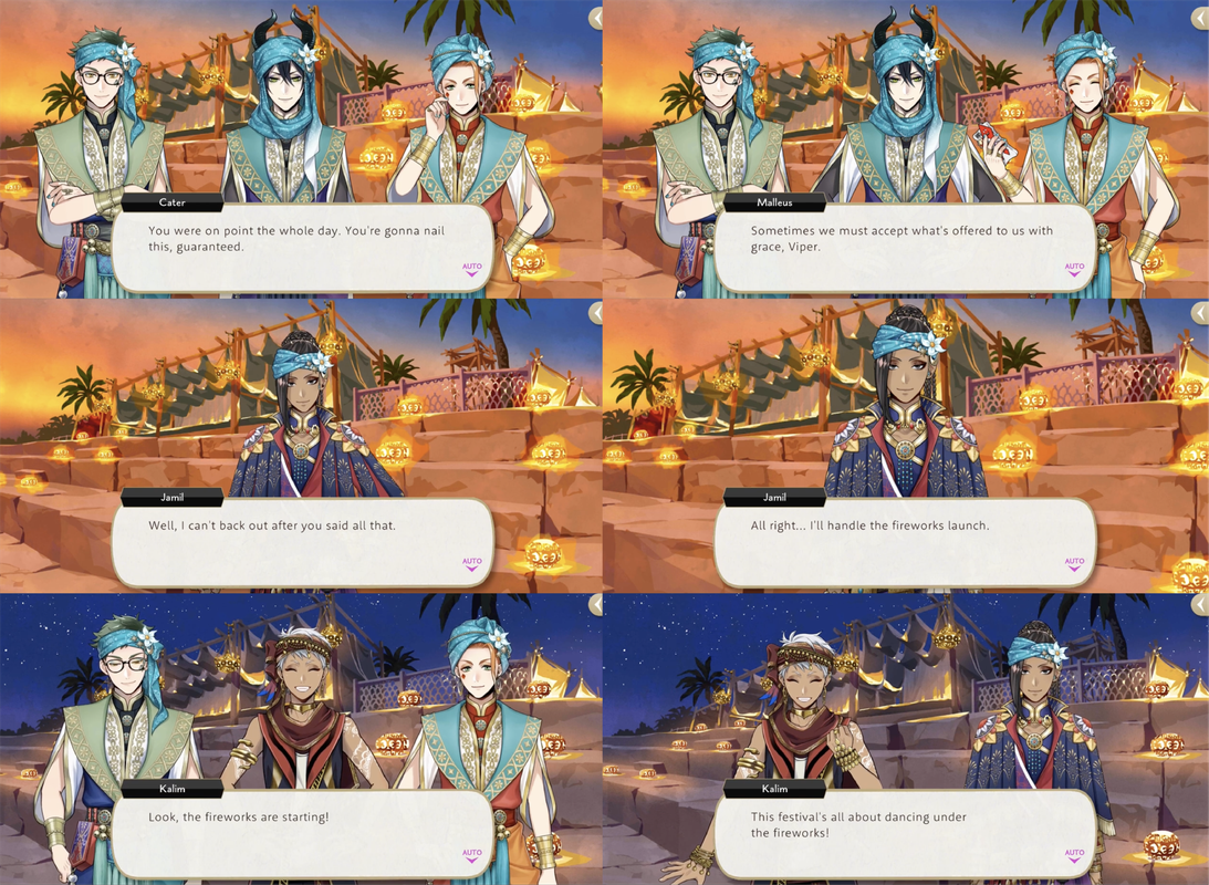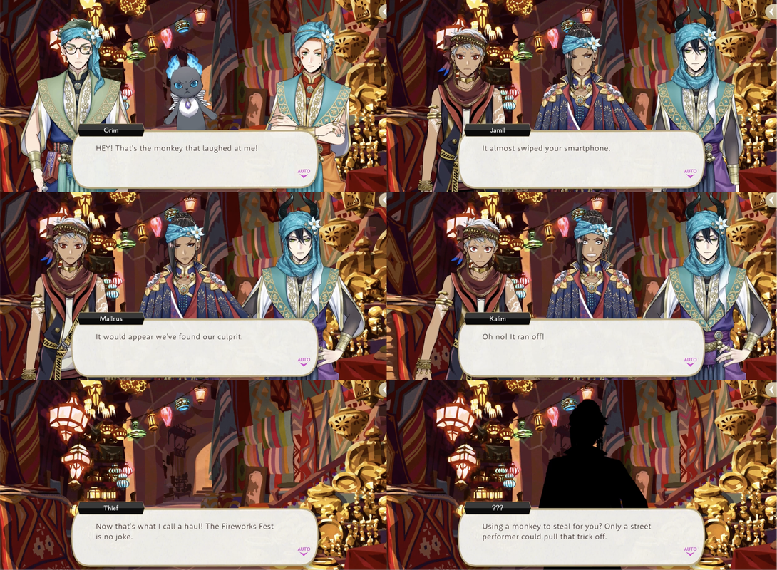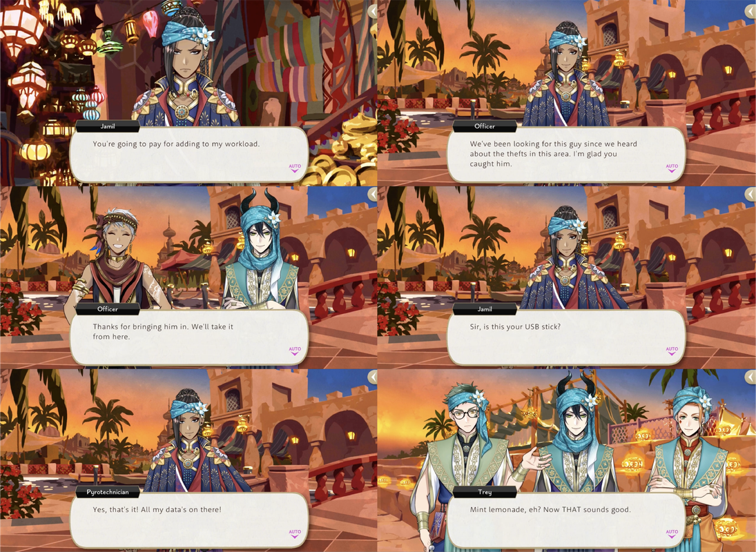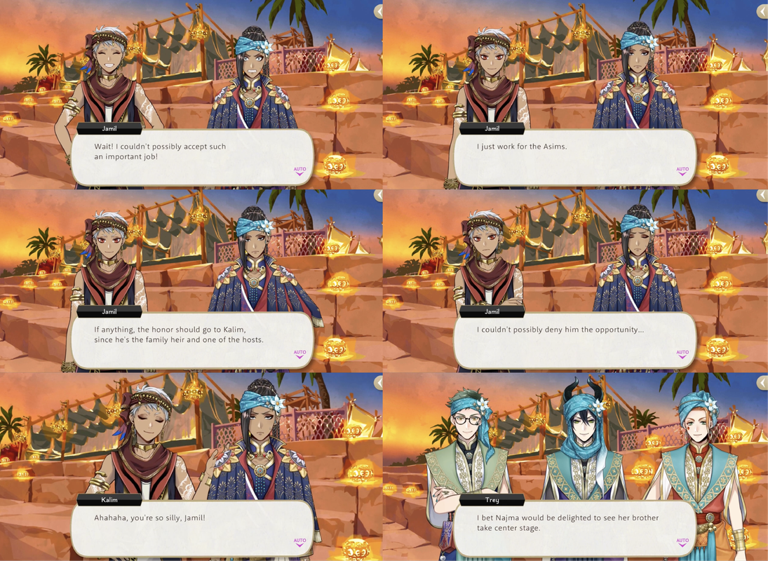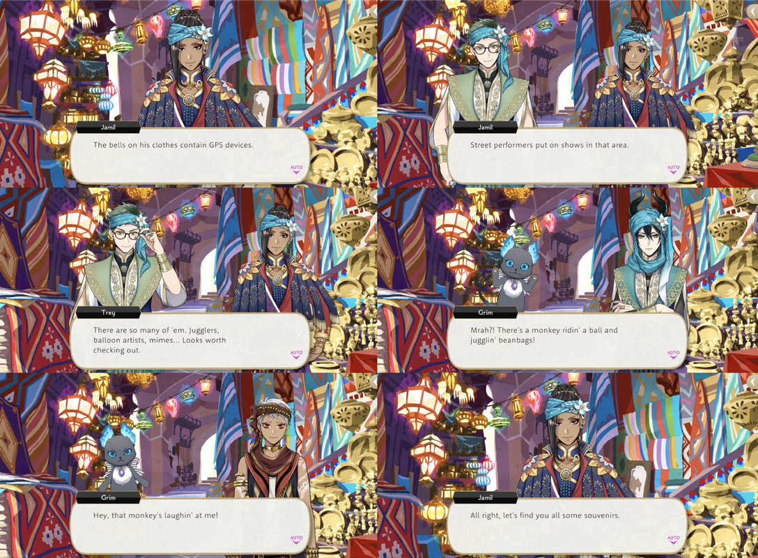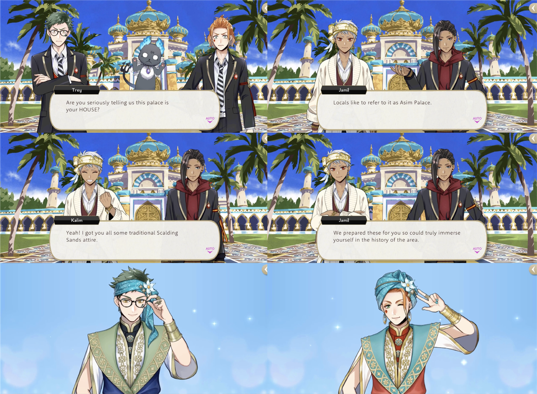 Kalim invites the pop music club, Cater and Lilia. Cater invites Trey and but Lilia has a stomach ache on the day of the event, sending Malleus alone in his place, for Malleus’ first trip without an escort. Jamil reluctantly concedes and the group travels to Silk City, where he and Kalim were born and raised.