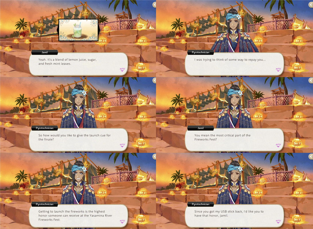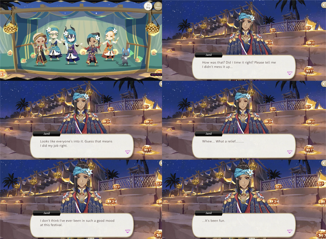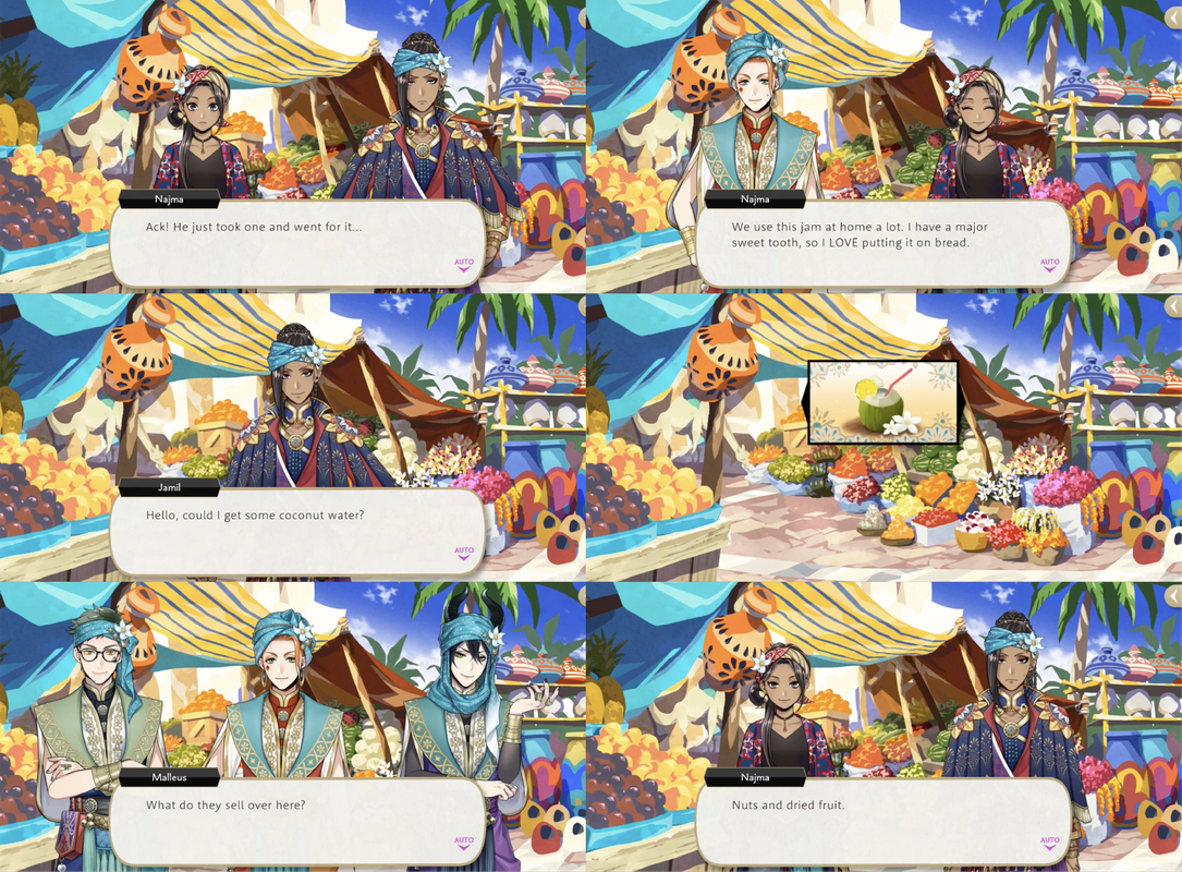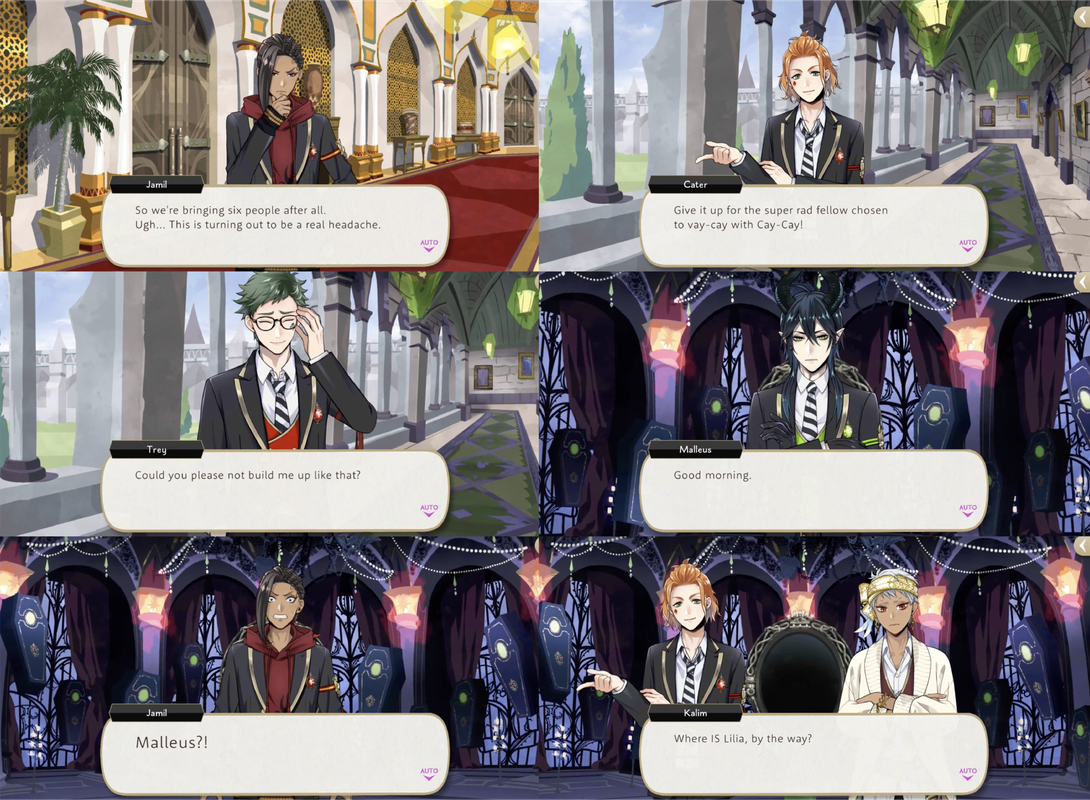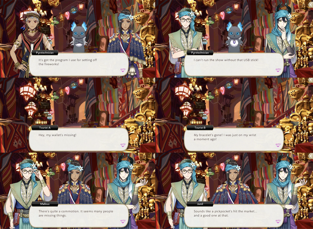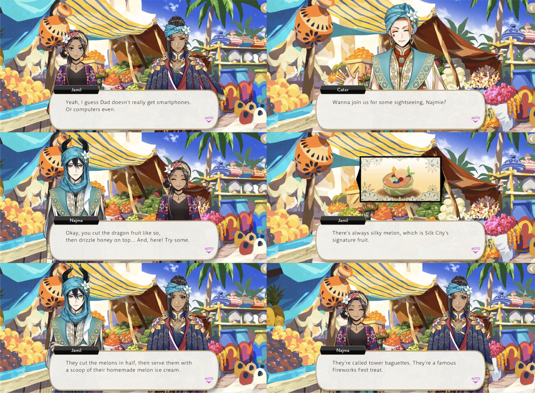 Kalim invites the pop music club, Cater and Lilia. Cater invites Trey and but Lilia has a stomach ache on the day of the event, sending Malleus alone in his place, for Malleus’ first trip without an escort. Jamil reluctantly concedes and the group travels to Silk City, where he and Kalim were born and raised.