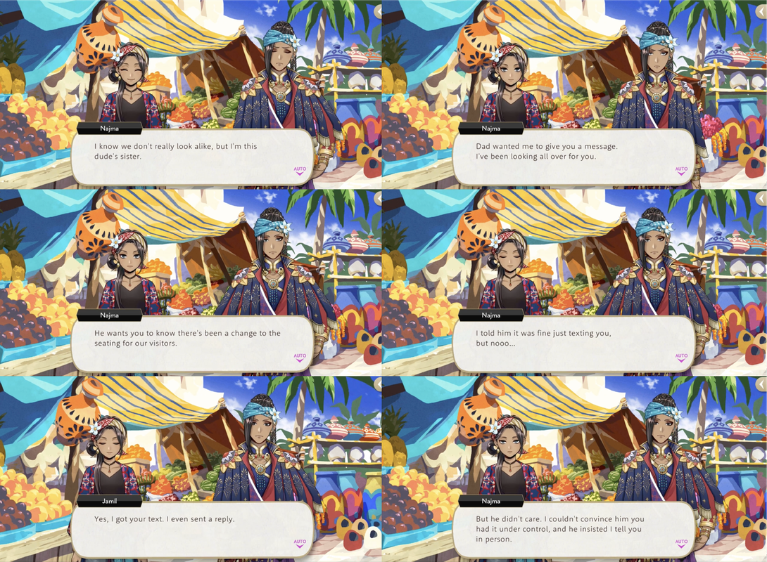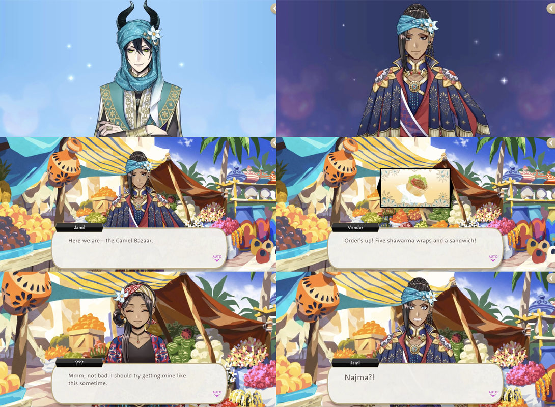 The group dresses in local attire and visits the Camel Bazaar for shawarma, where they meet with Jamil’s younger sister Najma, who was sent by their father to tell Jamil about a change to visitor seating.