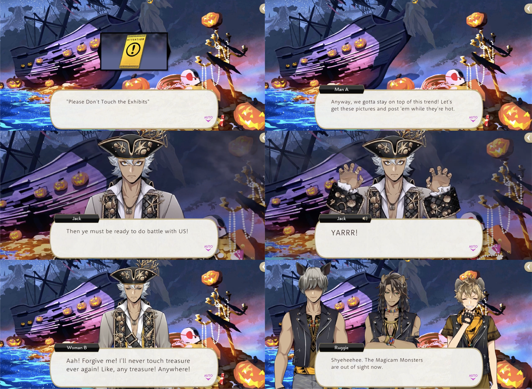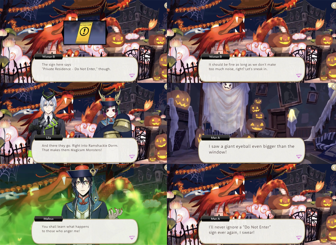 The students of each dorm enact different scenarios to scare the Magicam Monsters off campus, and as a result there are none to be found the following morning, and the Halloween Party is successful.