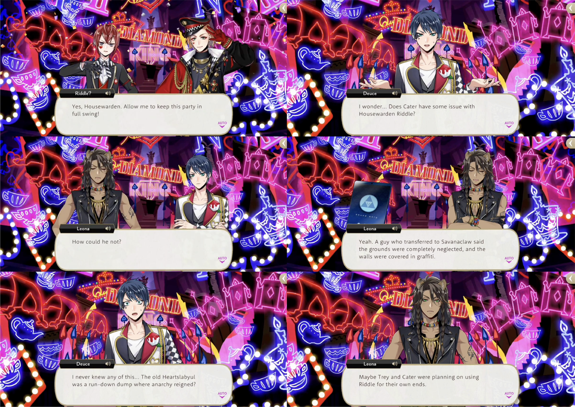 Deuce wonders if Cater has an issue with Riddle and Leona says he probably does, telling Deuce how Heartslabyul before Riddle was a run-down dump where anarchy reigned.