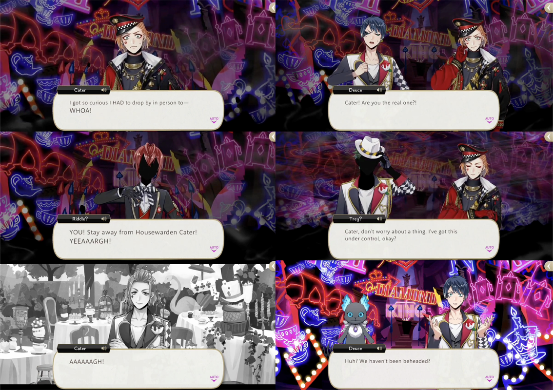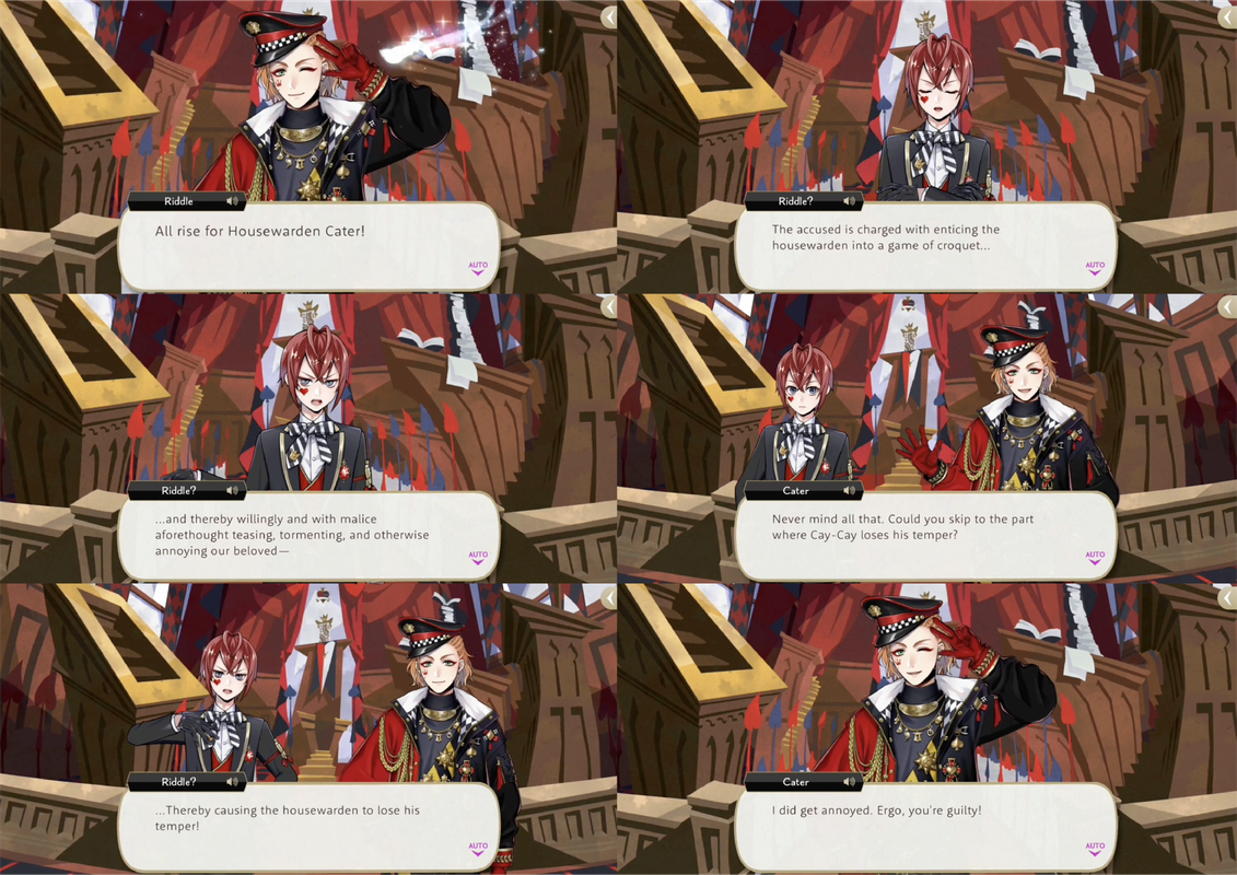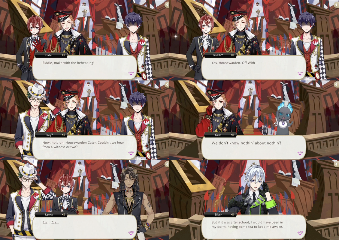 Heartslabyul is having a trial for a student accused of annoying Cater. Cater asks Riddle to take off the student’s head, but Trey interrupts to suggest they hear from witnesses.
