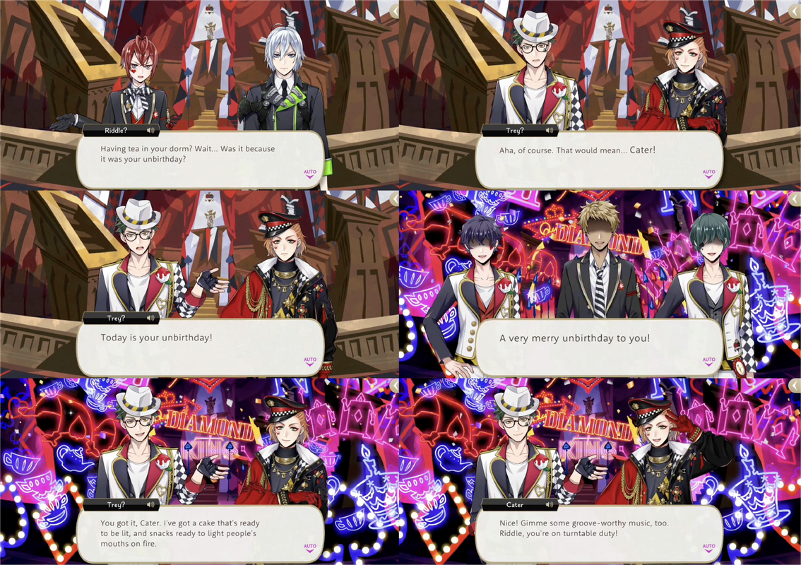 They call on the prefect, Grim, Leona and Silver, and realize that it is Cater’s unbirthday, leading to the launching of an Unbirthday Party. Trey prepares spicy food while Riddle DJs.