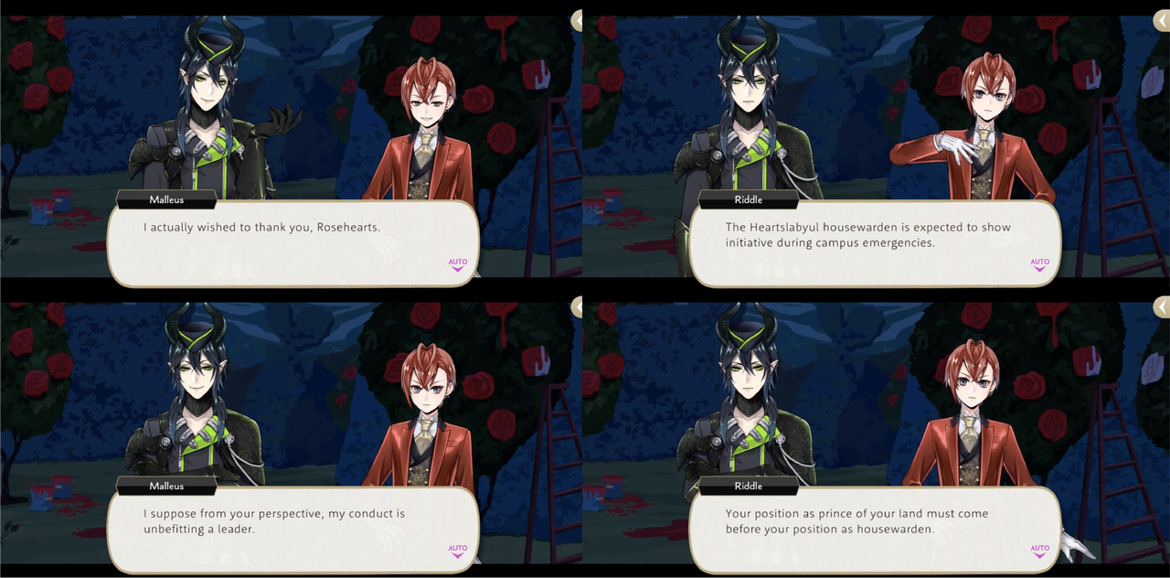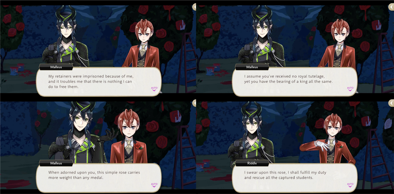 Malleus goes to Riddle to thank him for taking the risk that Malleus himself cannot, as he is the crown prince to Briar Valley, telling Riddle that he has “the bearing of a king.”