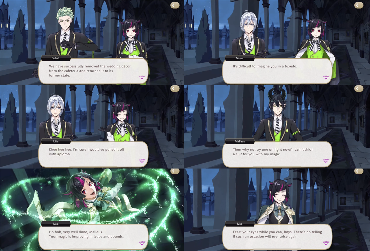 After the cafeteria has been cleaned Malleus appears, crafting a tuxedo from magic in order to thank Lilia for approaching Eliza in his stead.