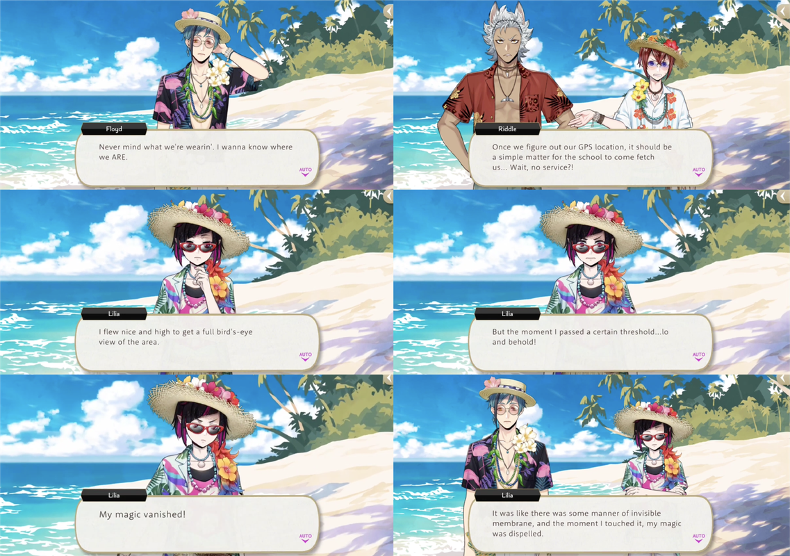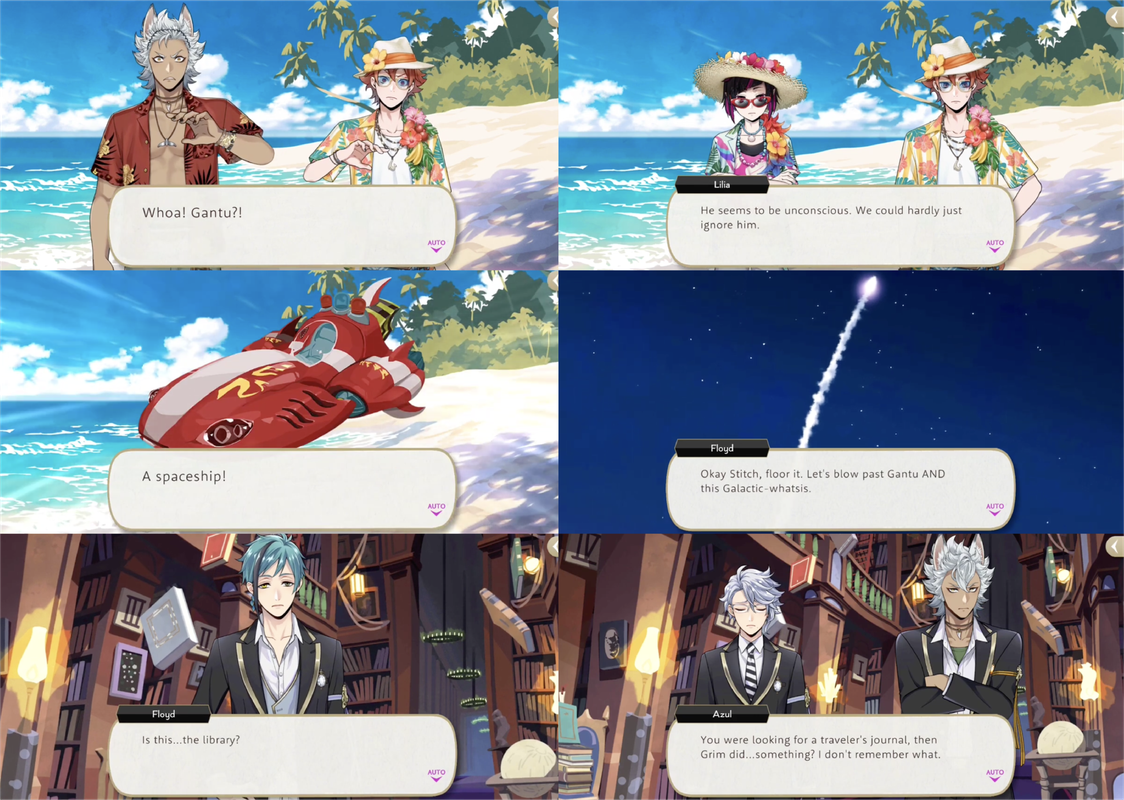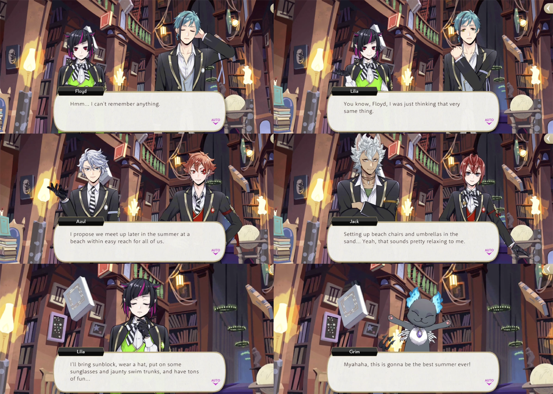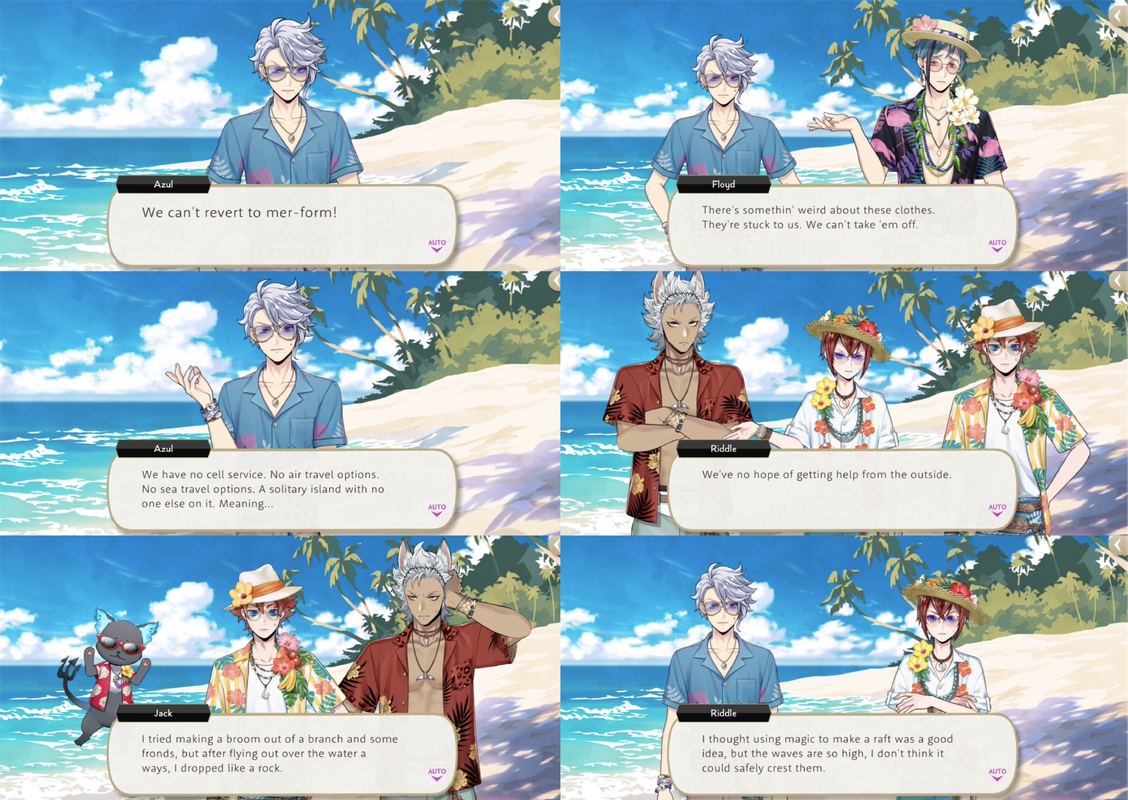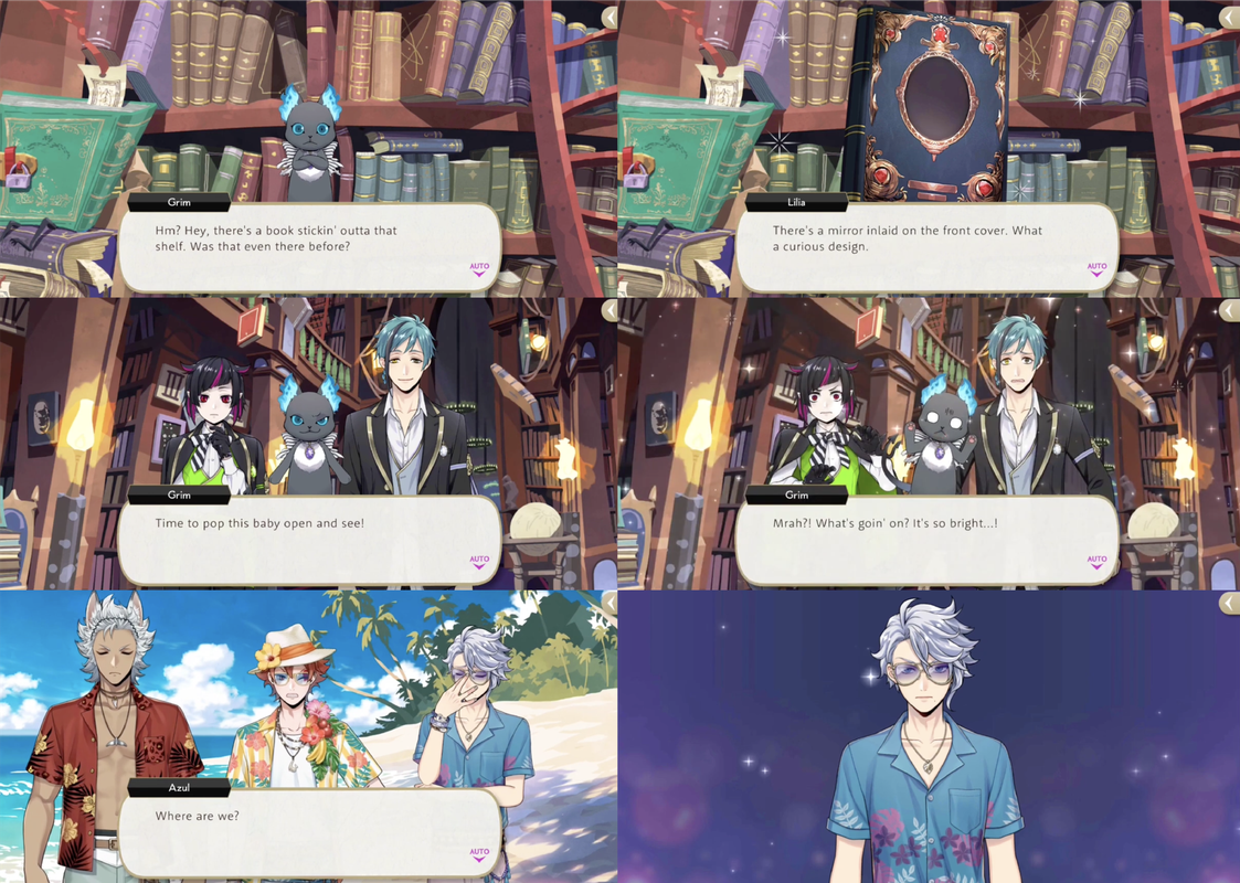 Grim finds a mysterious book with a mirror inlaid on the front cover in the school library. Upon opening it the book seems to transport Grim, Lilia, Floyd, Jack, Ace, Azul and the prefect to a deserted island dressed in tropical clothes.