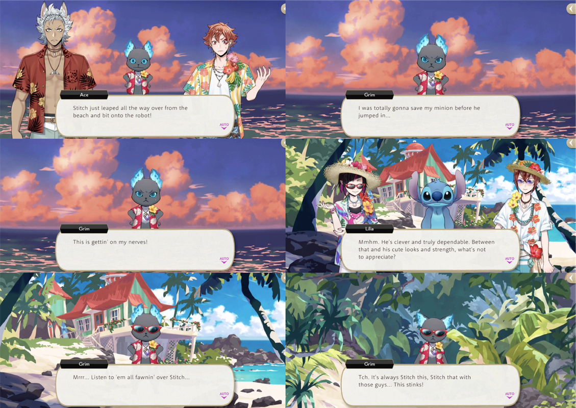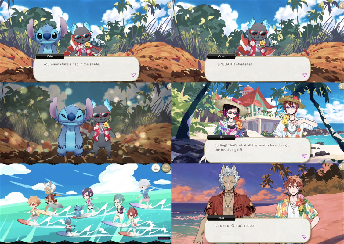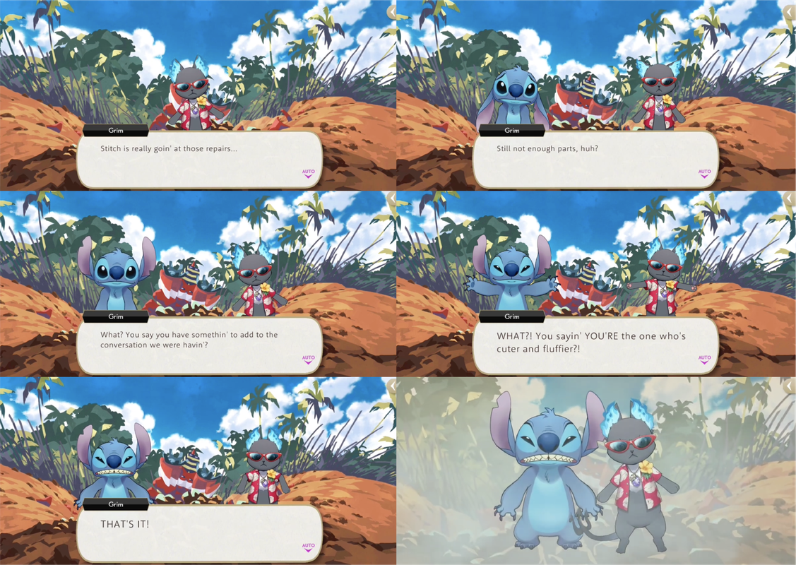 The next day Stitch and Grim get into a fight over who is cuter and fluffier, soon reconciling with Stitch’s idea that they take a nap. Later, the group goes surfing together.