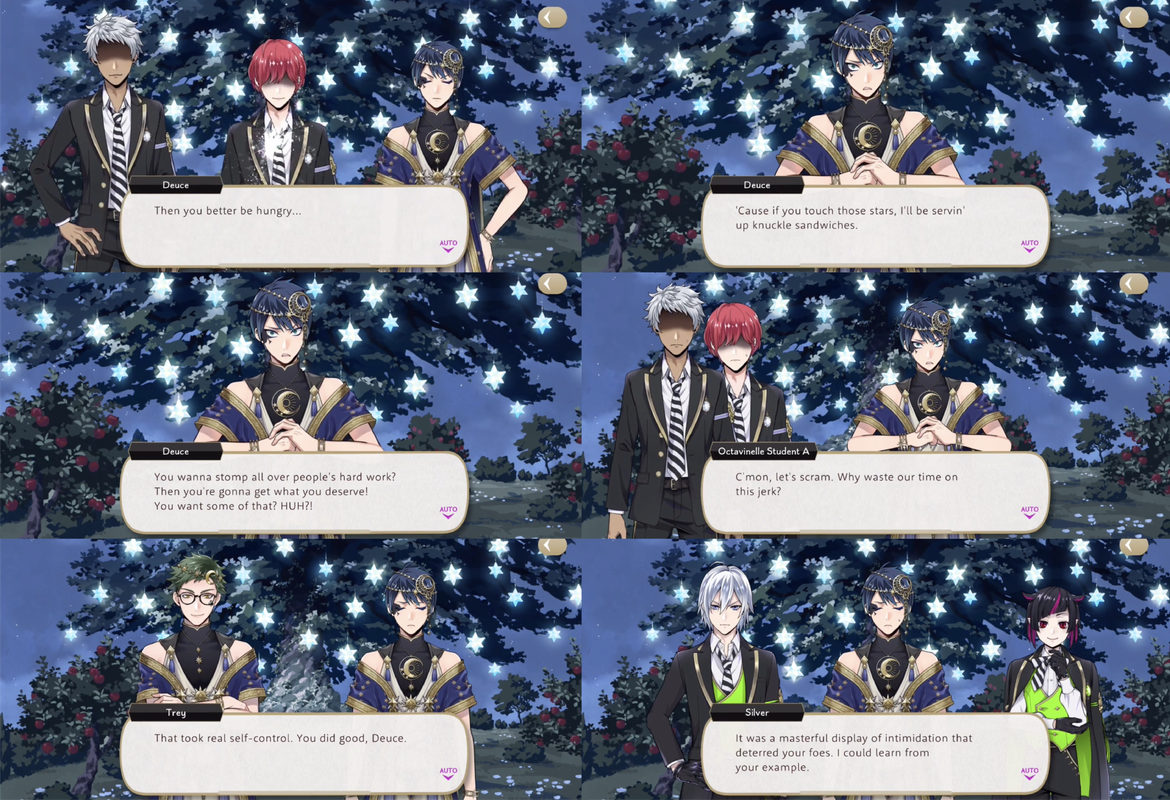 The day before the ceremony a pair of bullies tries to attack the wishing stars but Deuce intervenes. Deuce threatens them with violence and chases them away, earning himself praise from Trey and Silver.