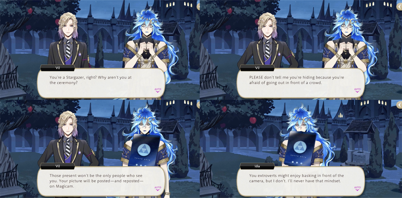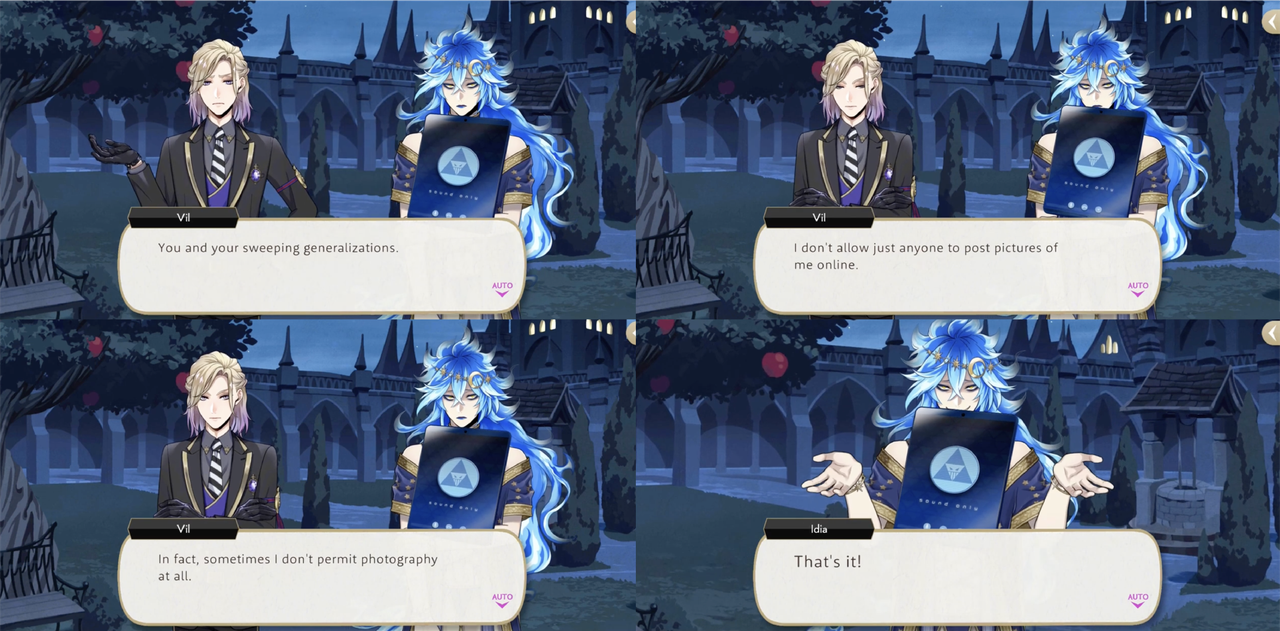 An anxious Idia coincidentally meets with Vil before his performance, who warns Idia that his poster is going to be posted online. Idia says that he will never have the mindset of “extroverts” who enjoy “basking in front of the camera” and Vil says that he sometimes does not permit people to photograph him at all, inspiring Idia.