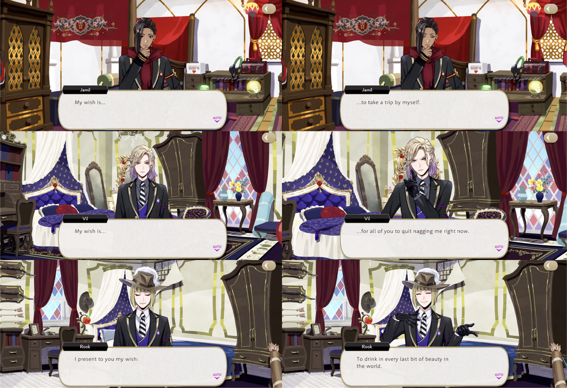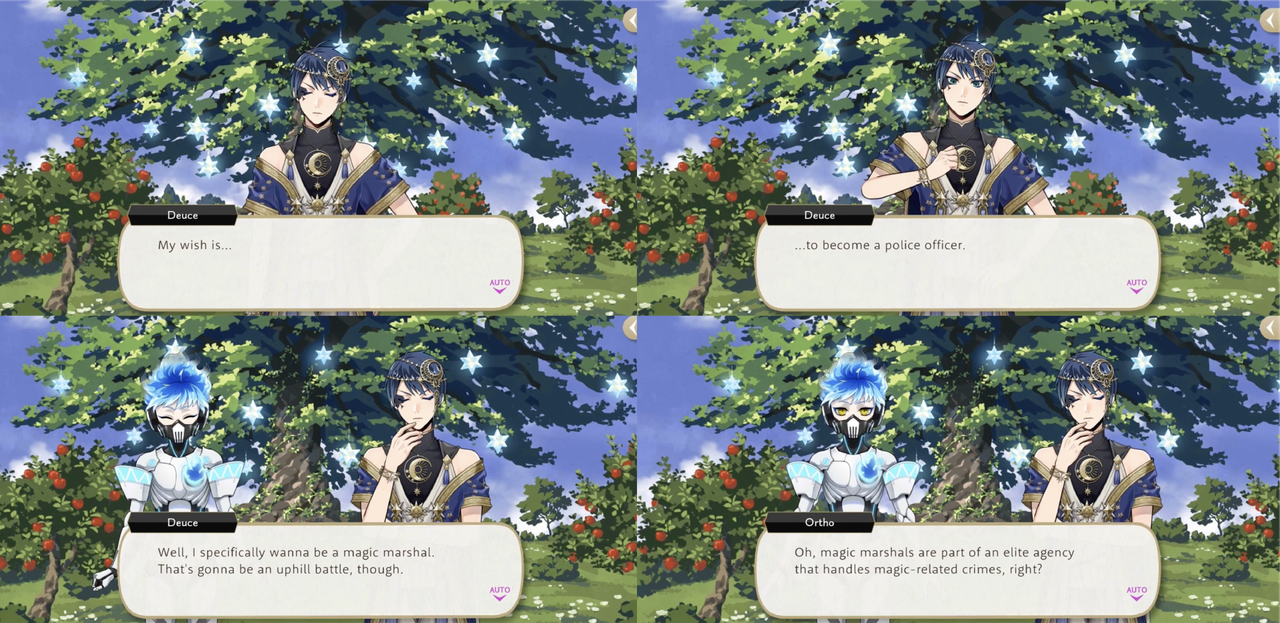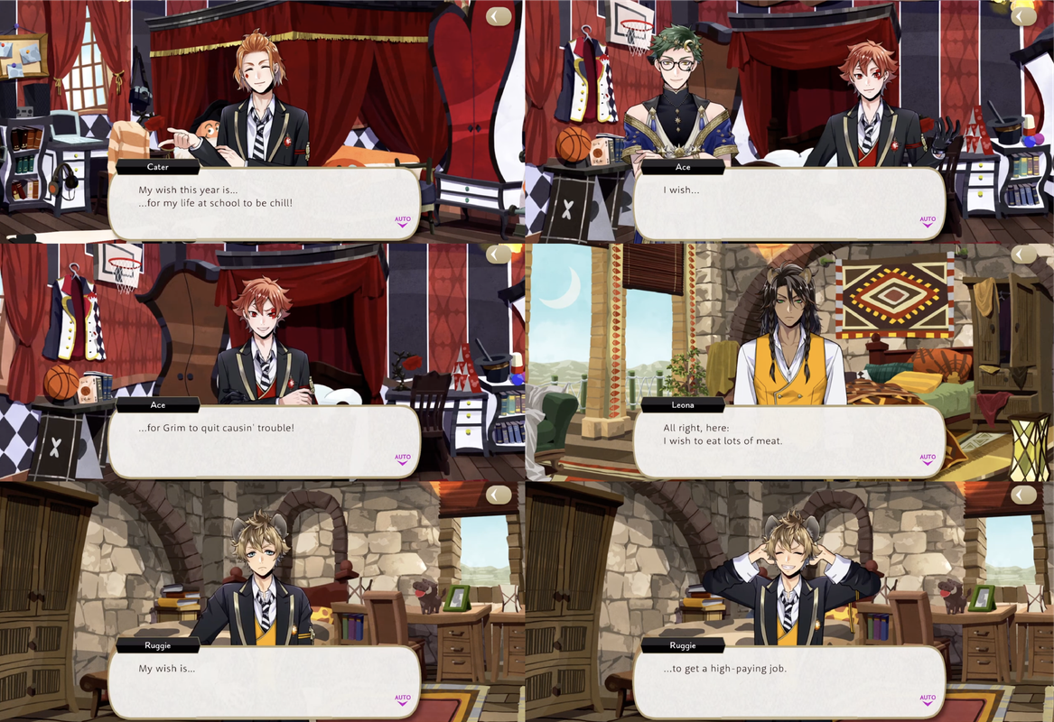 Deuce wishes to become a police officer, while Idia wishes for a sequel to video game “Star Rogue.” Ortho explains than he and Idia would play it together often when they were younger, but the development team disbanded after announcing the sequel, and they have been waiting for production to resume ever since.