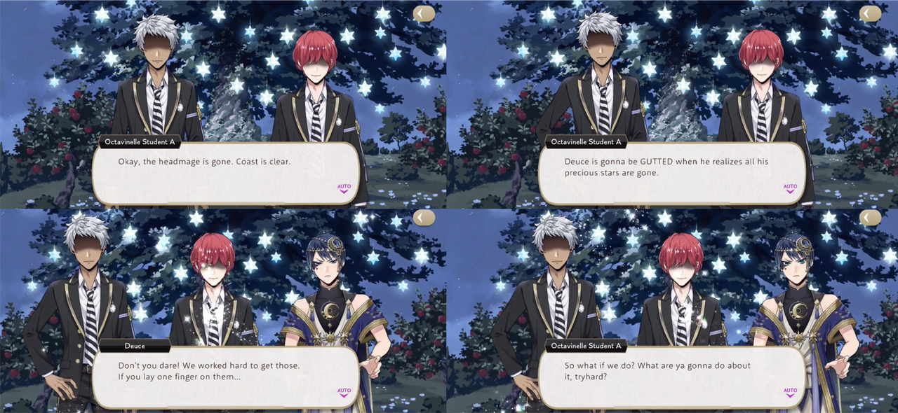 Trey, Idia, and Deuce are selected as Stargazers, but Idia refuses to participate in fear of public humiliation.