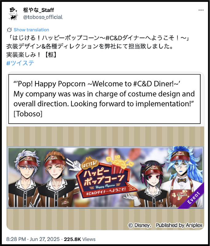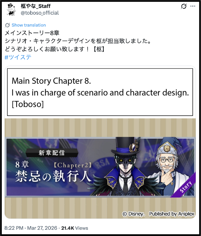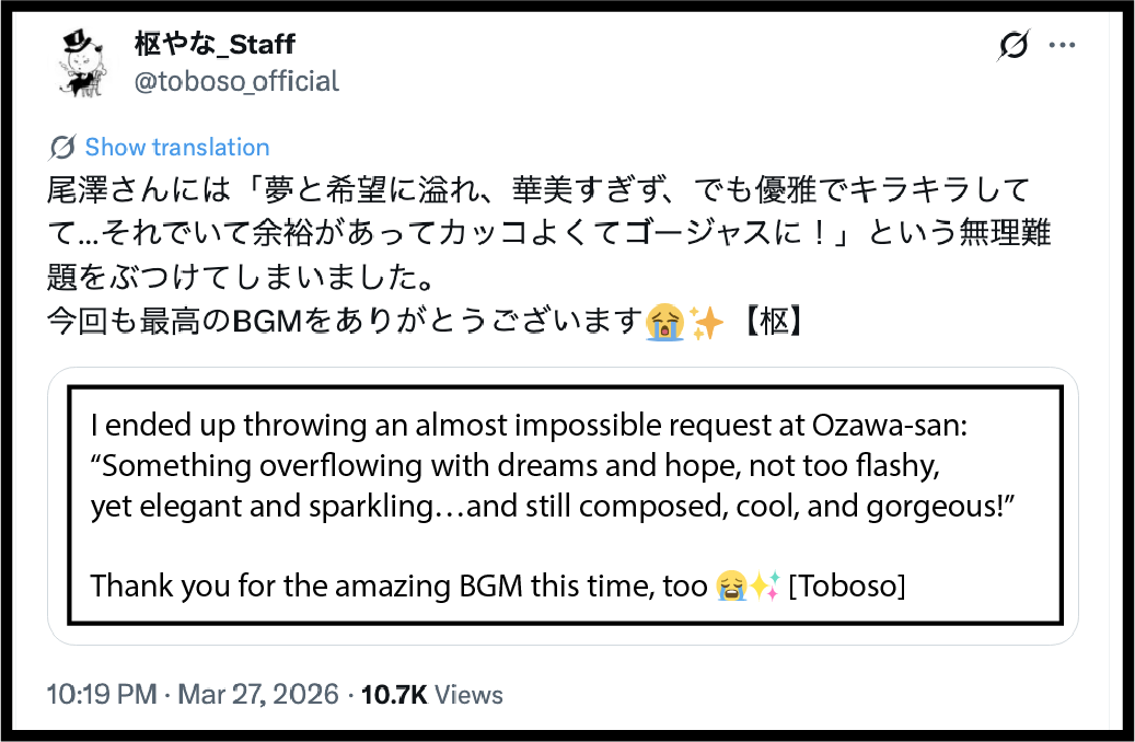 It is possibly Yana who gives the requests and directions for all of Twst’s background music to composer Ozawa Takumi: on 2026/4/27 following the release of Book 8 Chapter 2, Yana posted: